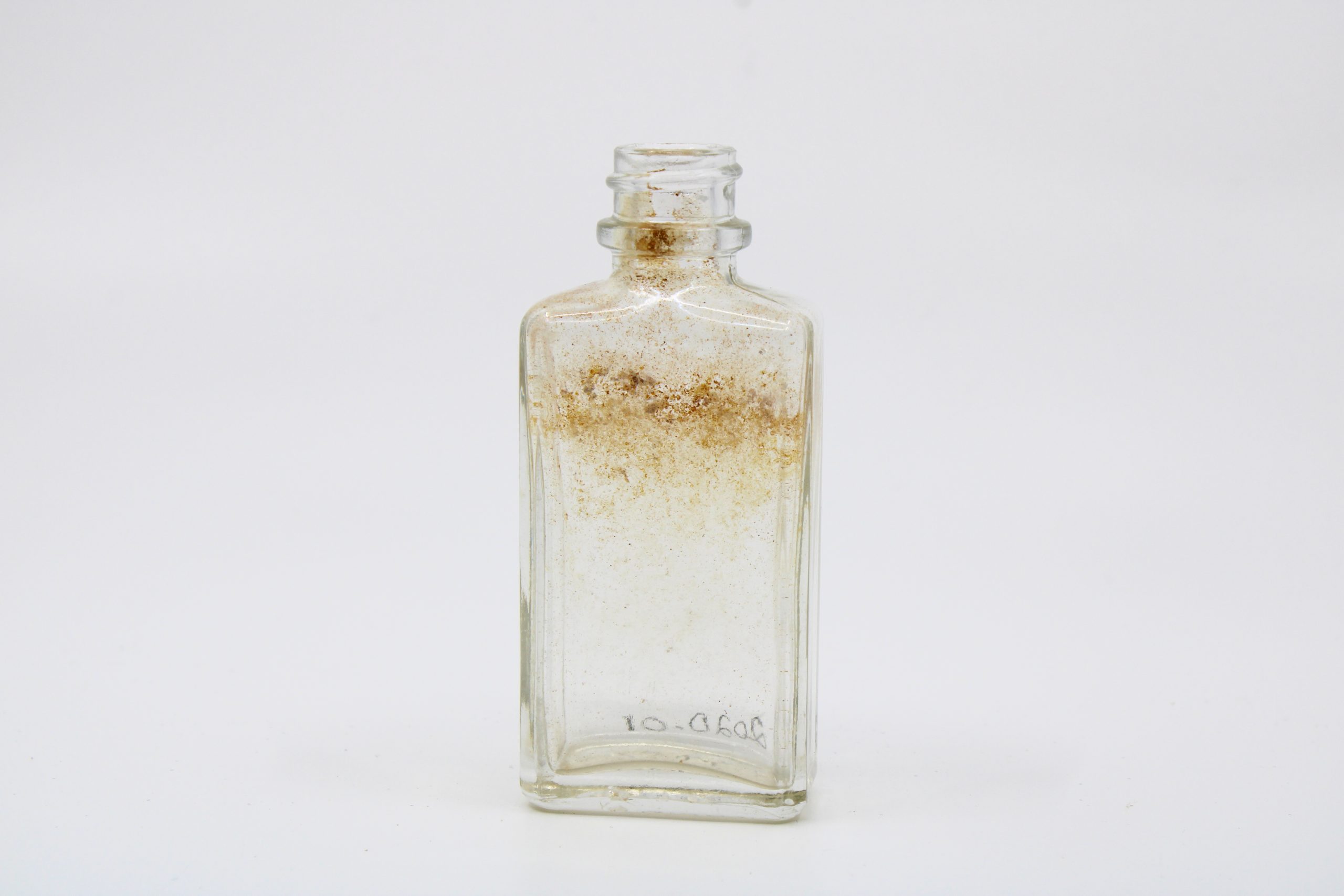 Small, clear glass rectangular bottle with straight sides, a short neck, and a threaded top designed for a screw-on cap (now missing). The glass is sl