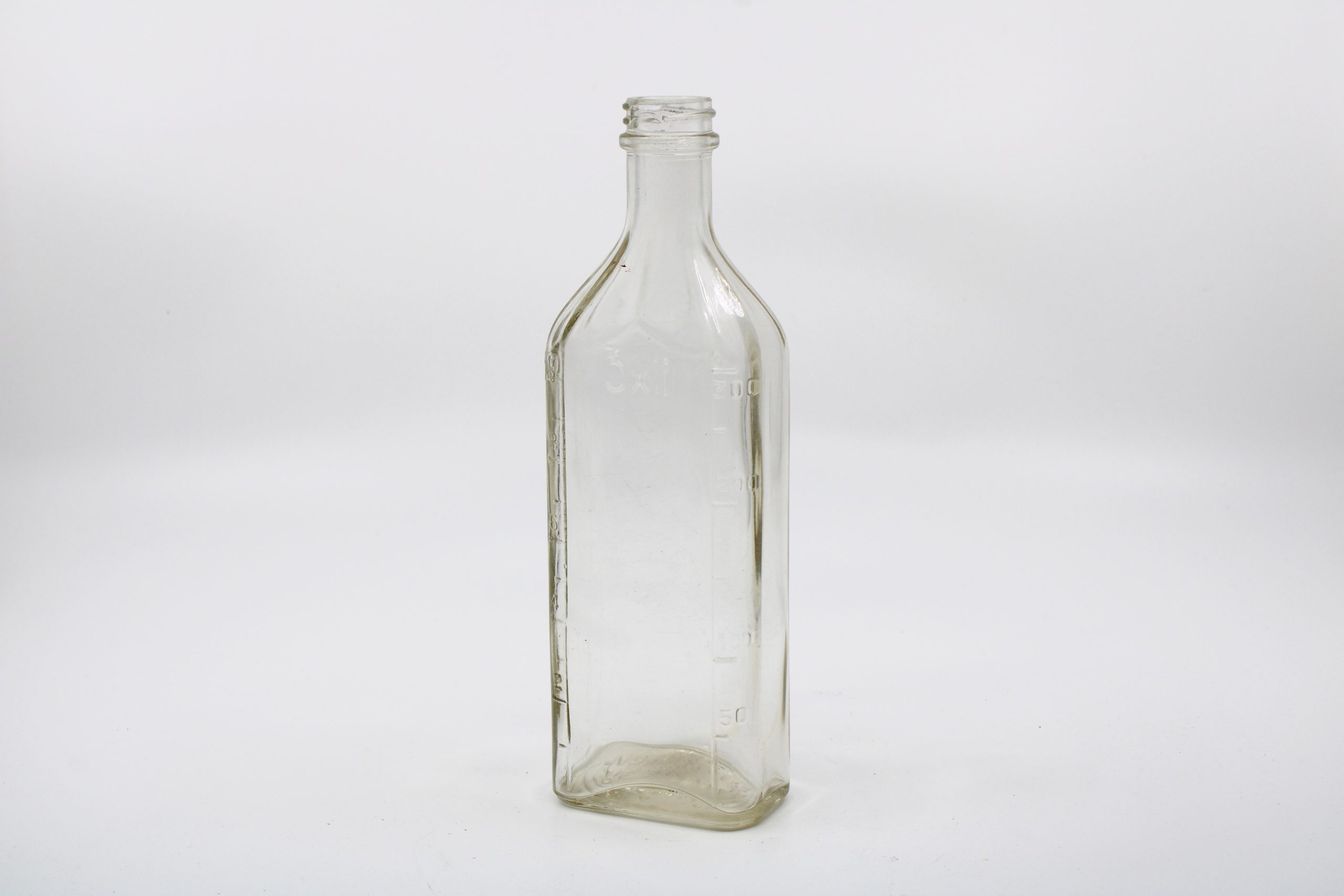 A tall, clear glass rectangular bottle with gently sloped shoulders and a narrow threaded neck designed to hold a screw cap (missing).