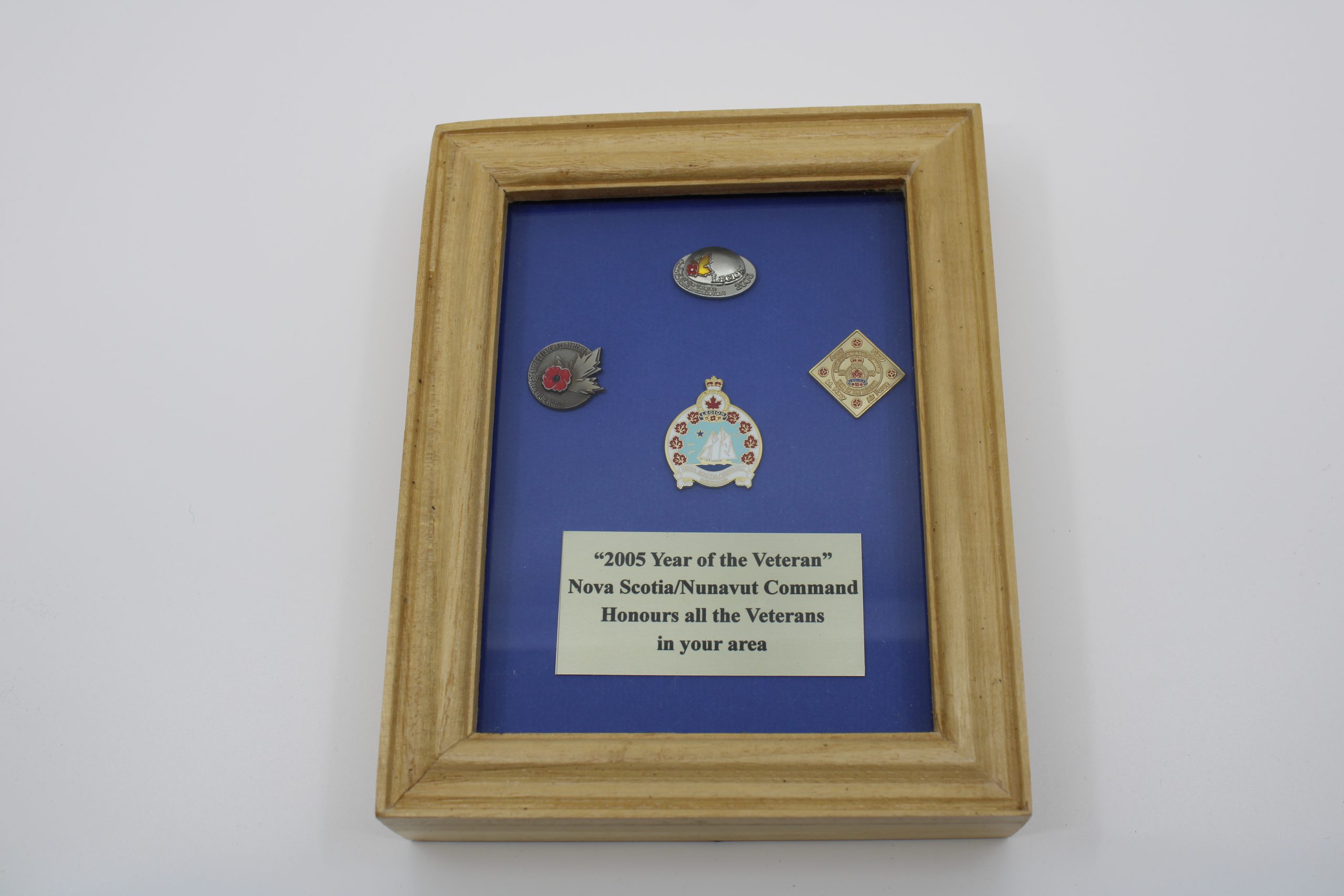 Framed commemorative display containing four veteran pins mounted on a blue background, accompanied by a printed label reading: “2005 Year of the Ve