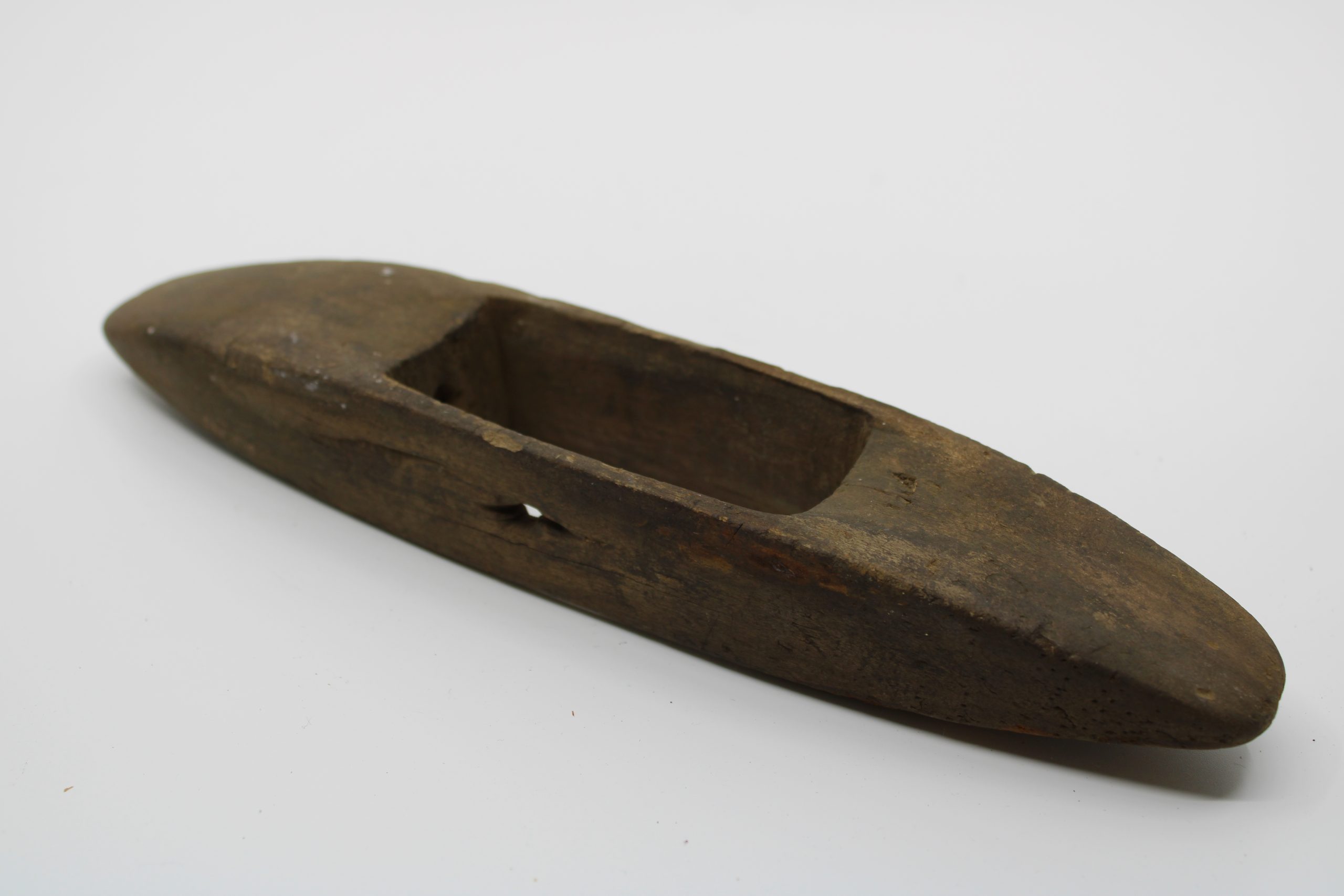 A wooden weaving shuttle with a hollow center cavity for holding a bobbin or spool of thread. The shuttle is boat-shaped, pointed at both ends, and sm