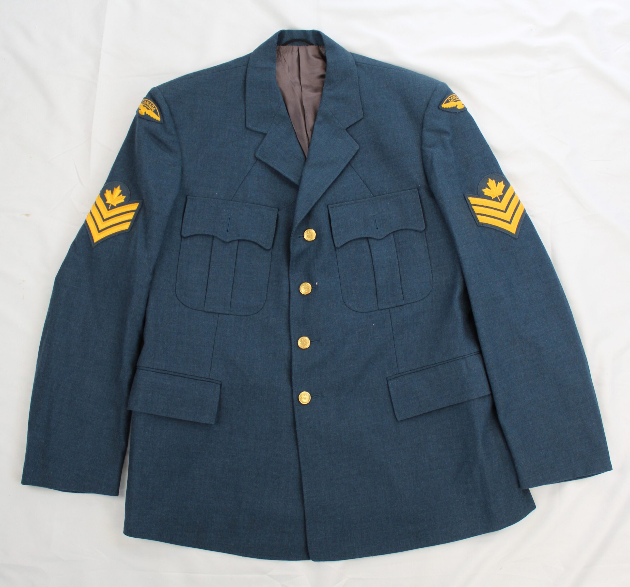 Blue wool-blend Royal Canadian Air Force dress jacket featuring four gilt metal buttons down the front, two pleated chest pockets with buttoned flaps,