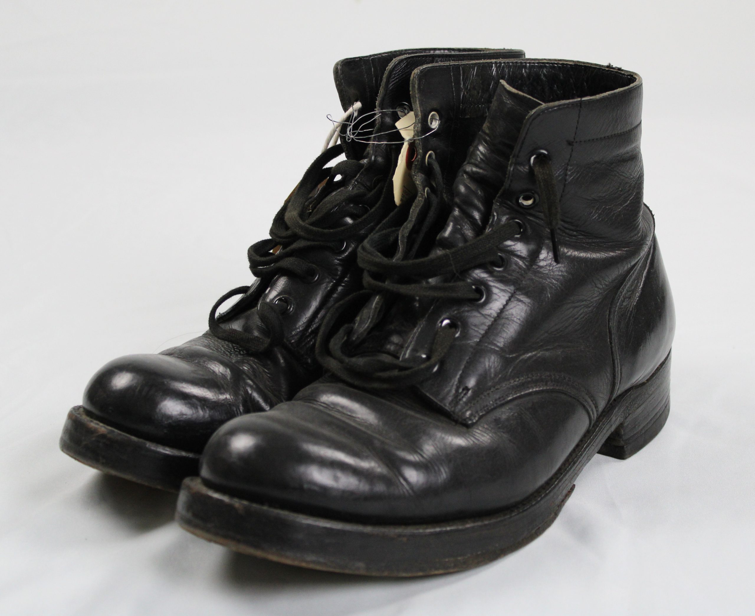 Pair of black leather lace-up combat boots with rounded toes, reinforced stitching, and ankle-high construction. Each boot features eight pairs of met