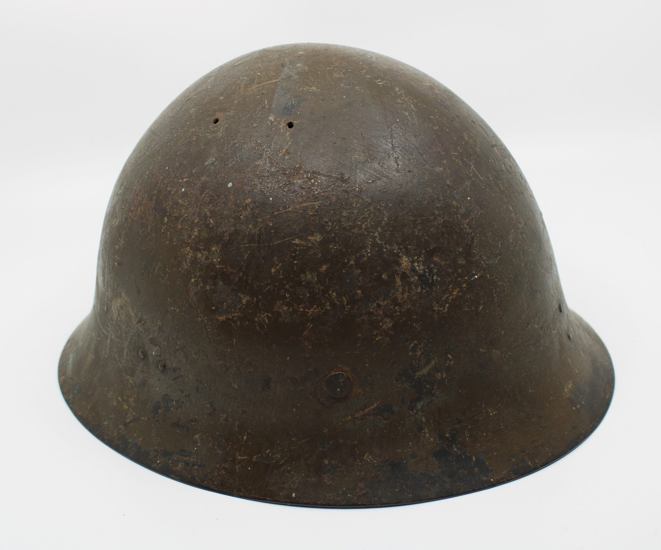 A brown-painted steel combat helmet featuring a simple rounded dome with a short, flared brim. The exterior surface shows wear, scratches, and patina
