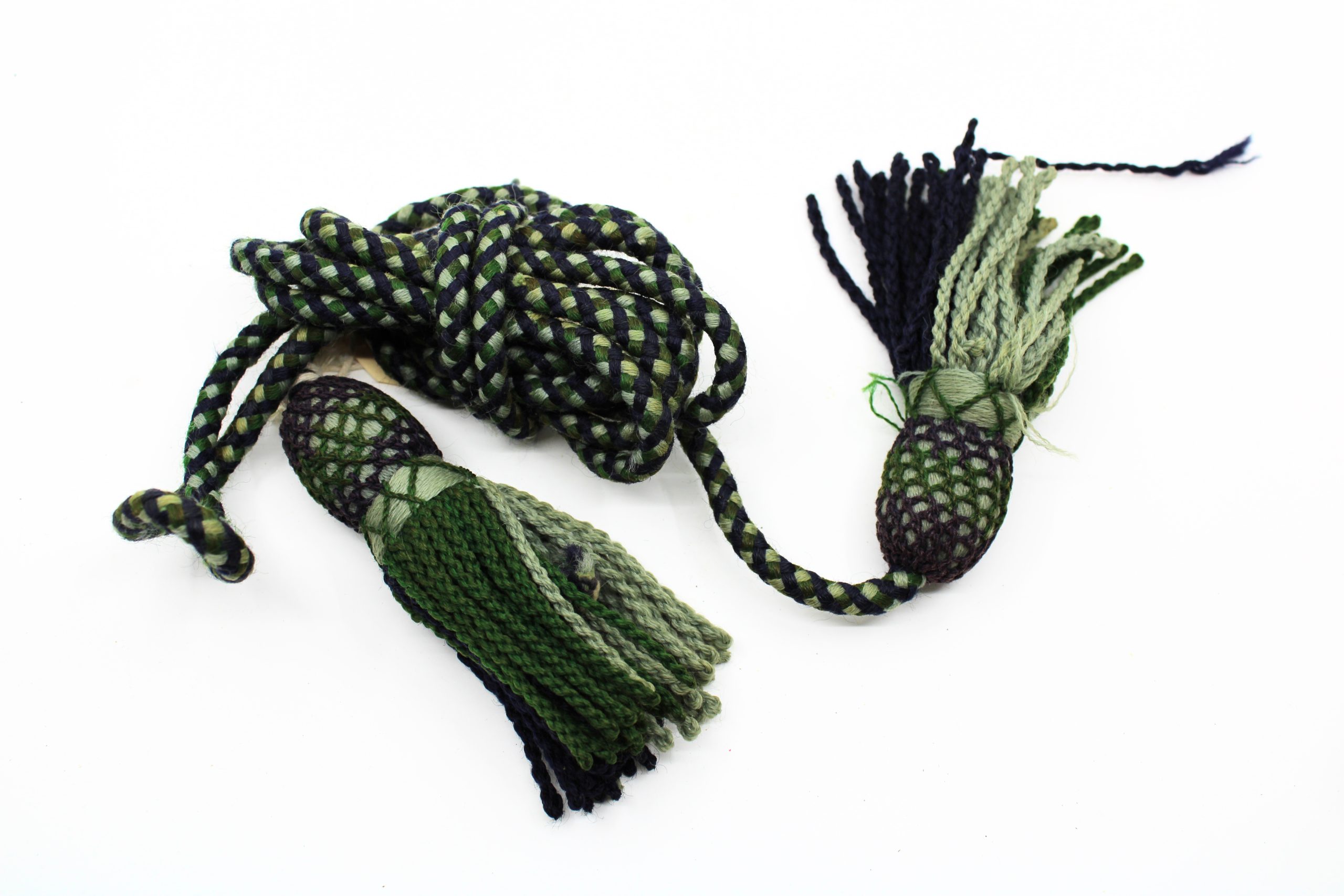 Braided paracord-style dress cord composed of alternating dark green and navy threads. Each end terminates in a large decorative tassel formed of brai