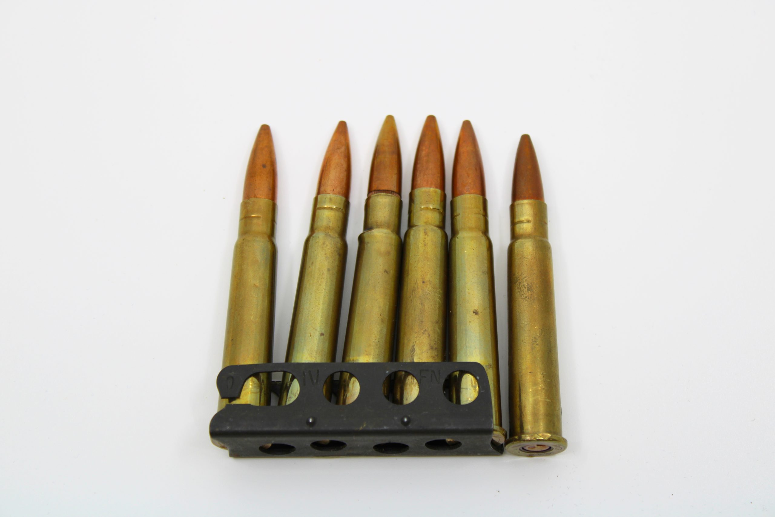 Set of six .303 caliber cartridges mounted on a black metal stripper clip. Each cartridge consists of a brass casing and copper-jacketed bullet, typic