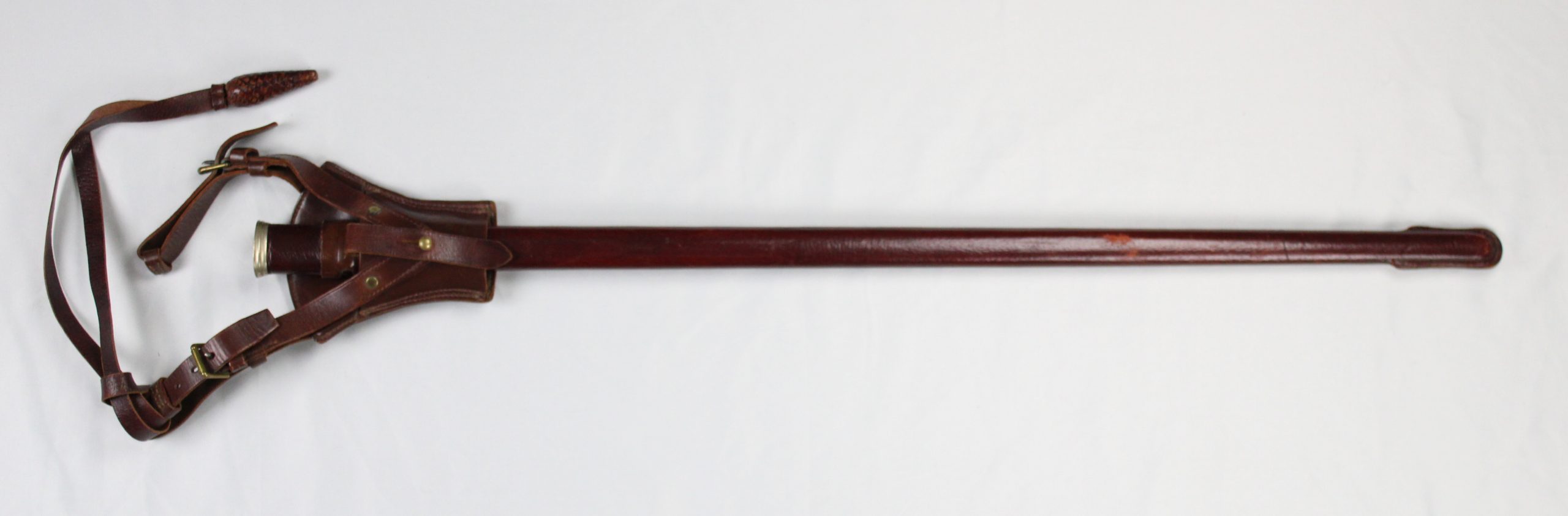 A brown leather sword scabbard with attached shoulder strap and frog assembly. The scabbard is rigid and reinforced, likely made to fit a British offi