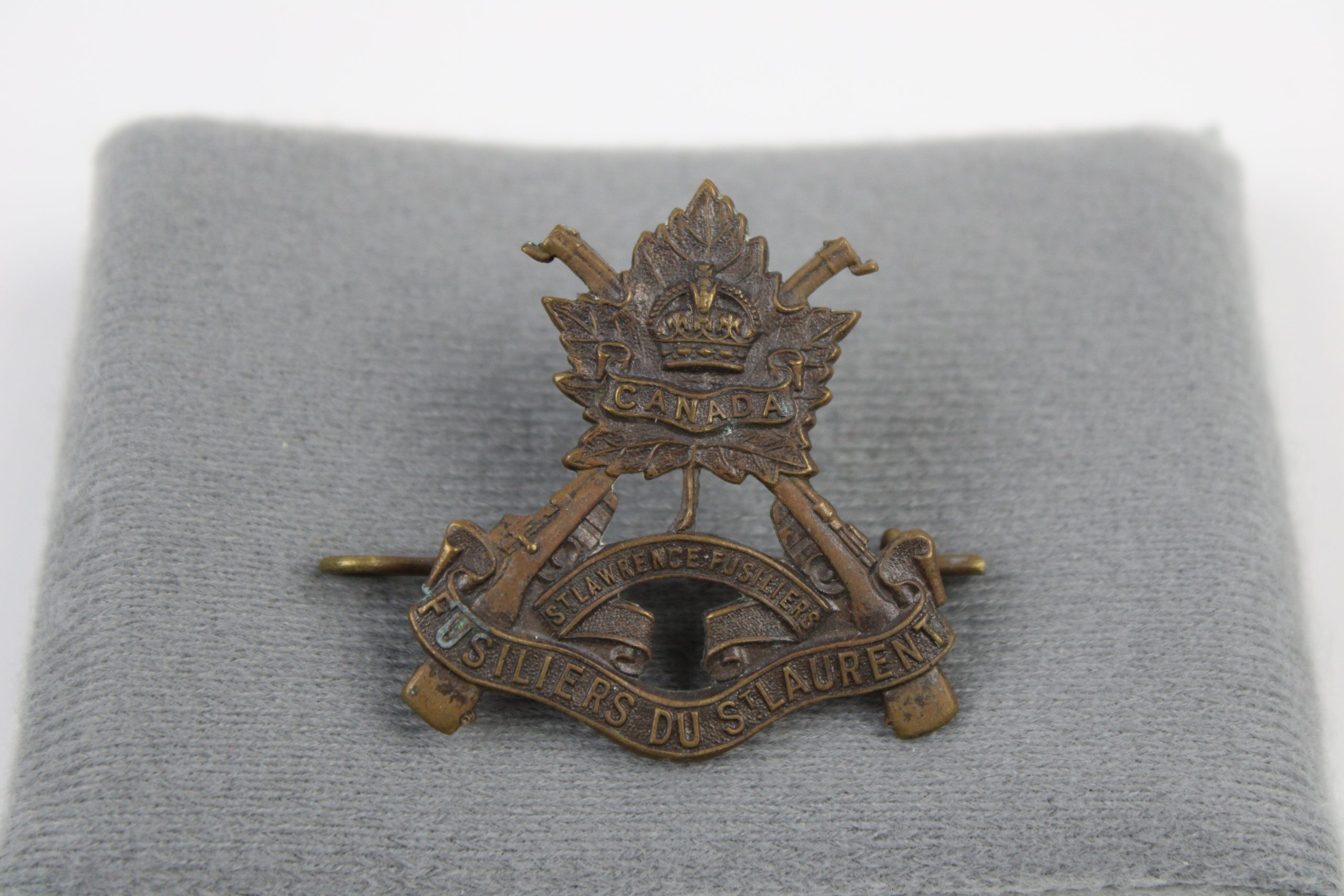 Bronze-colored metal cap badge featuring a maple leaf surmounted by a king’s crown, with two crossed rifles behind it. Across the central banner app