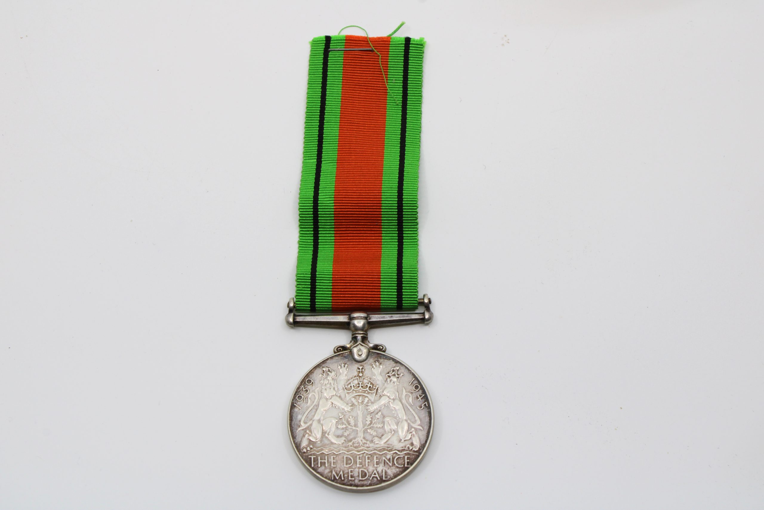 Circular silver campaign medal suspended from a silk ribbon with broad green outer bands, narrow black stripes, and a wide orange center stripe. The o