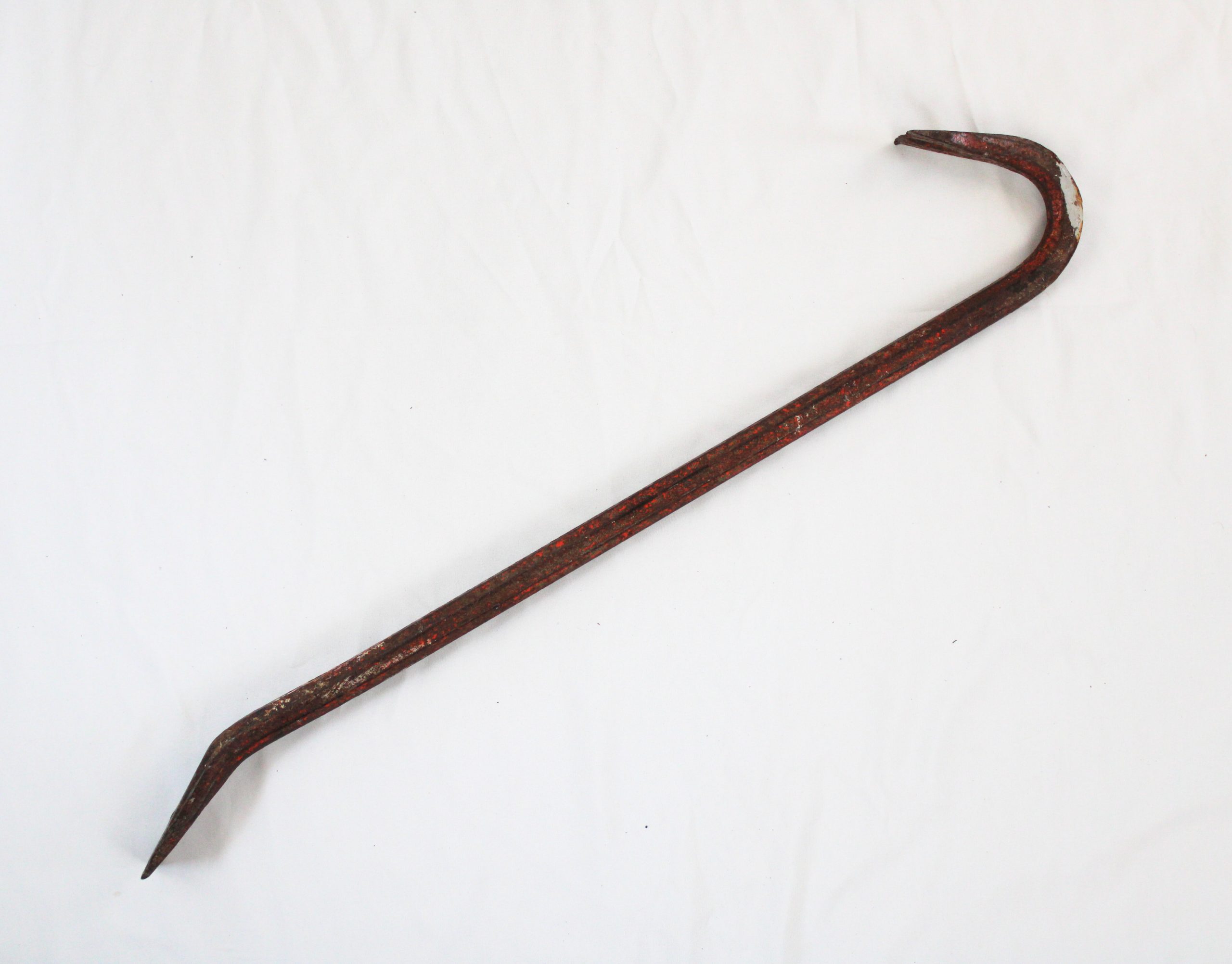 A solid iron crowbar with one curved claw end and one tapered, chisel-like end. The bar is slightly rusted with traces of red paint along its length,