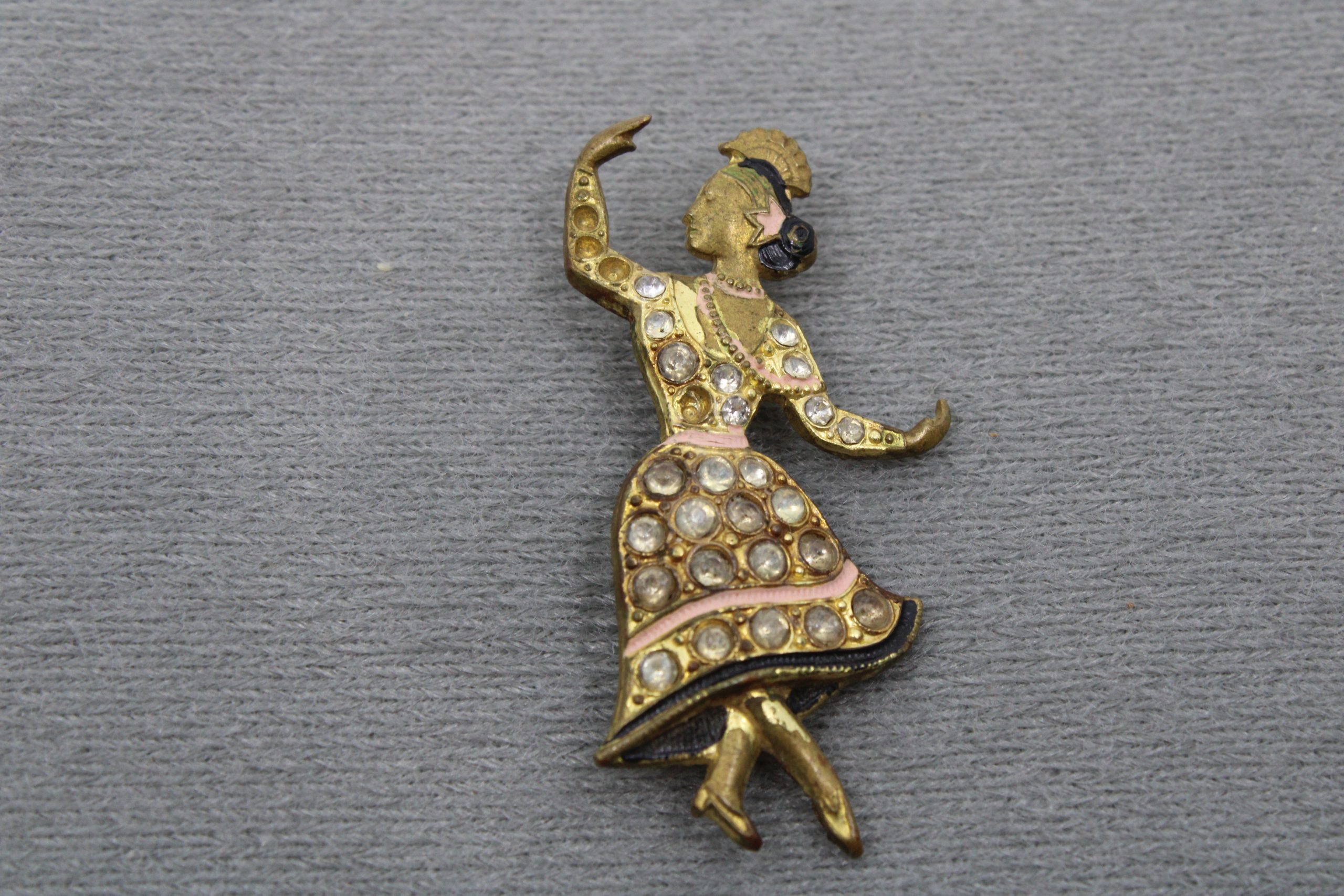 Figural brooch depicting a dancing woman, made of gold-tone metal and embellished with clear rhinestones and enamel details. The figure is shown mid-m