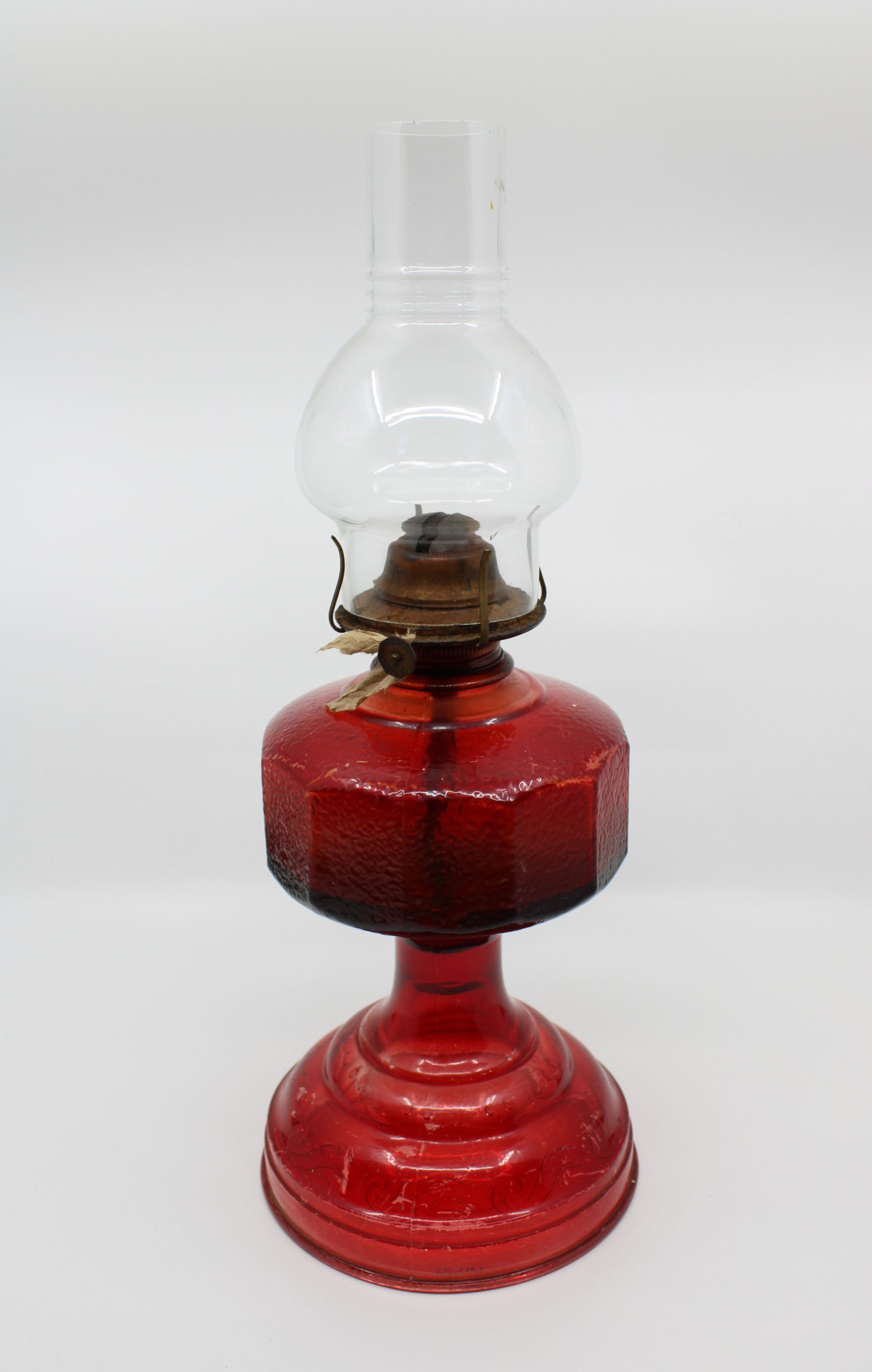 A red glass oil lamp composed of a molded glass base and reservoir with a clear glass chimney.