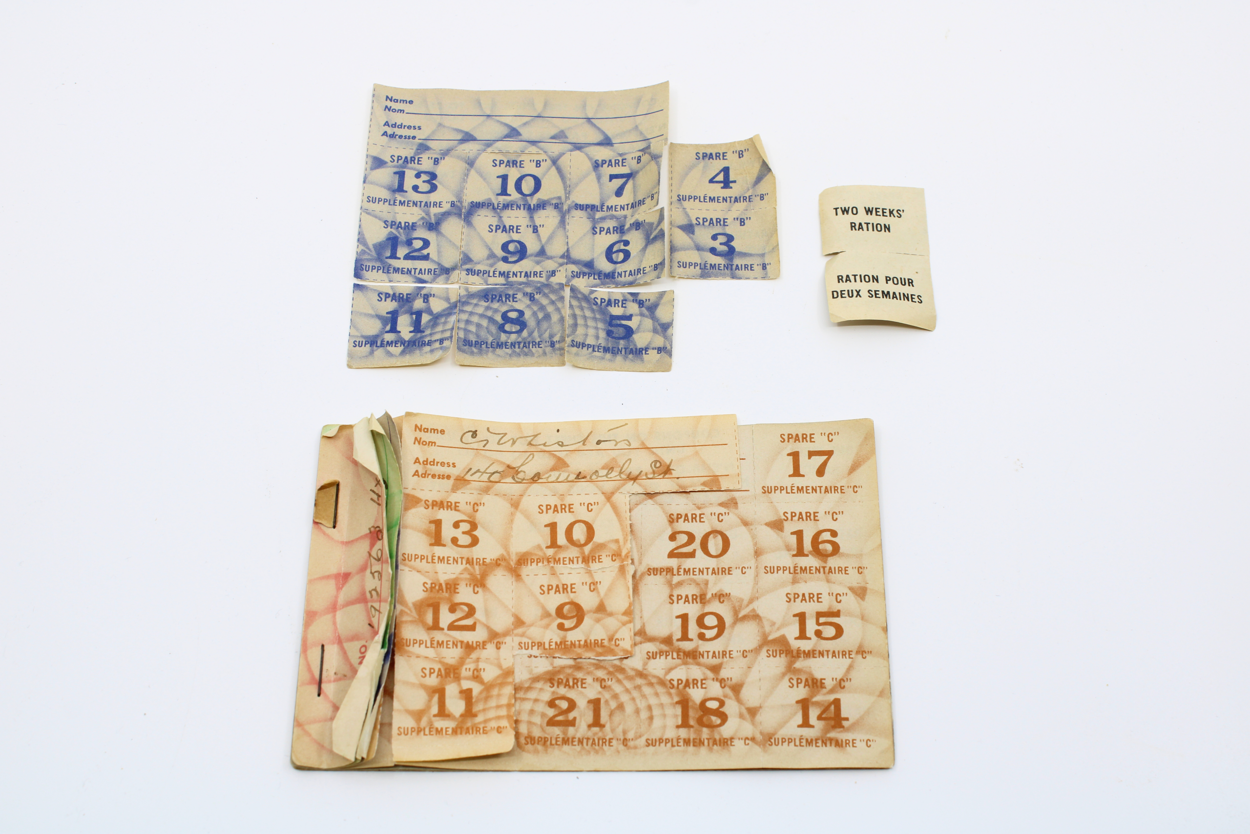 Small paper ration booklet consisting of blue printed coupons marked “SPARE B” and numbered 3–14.