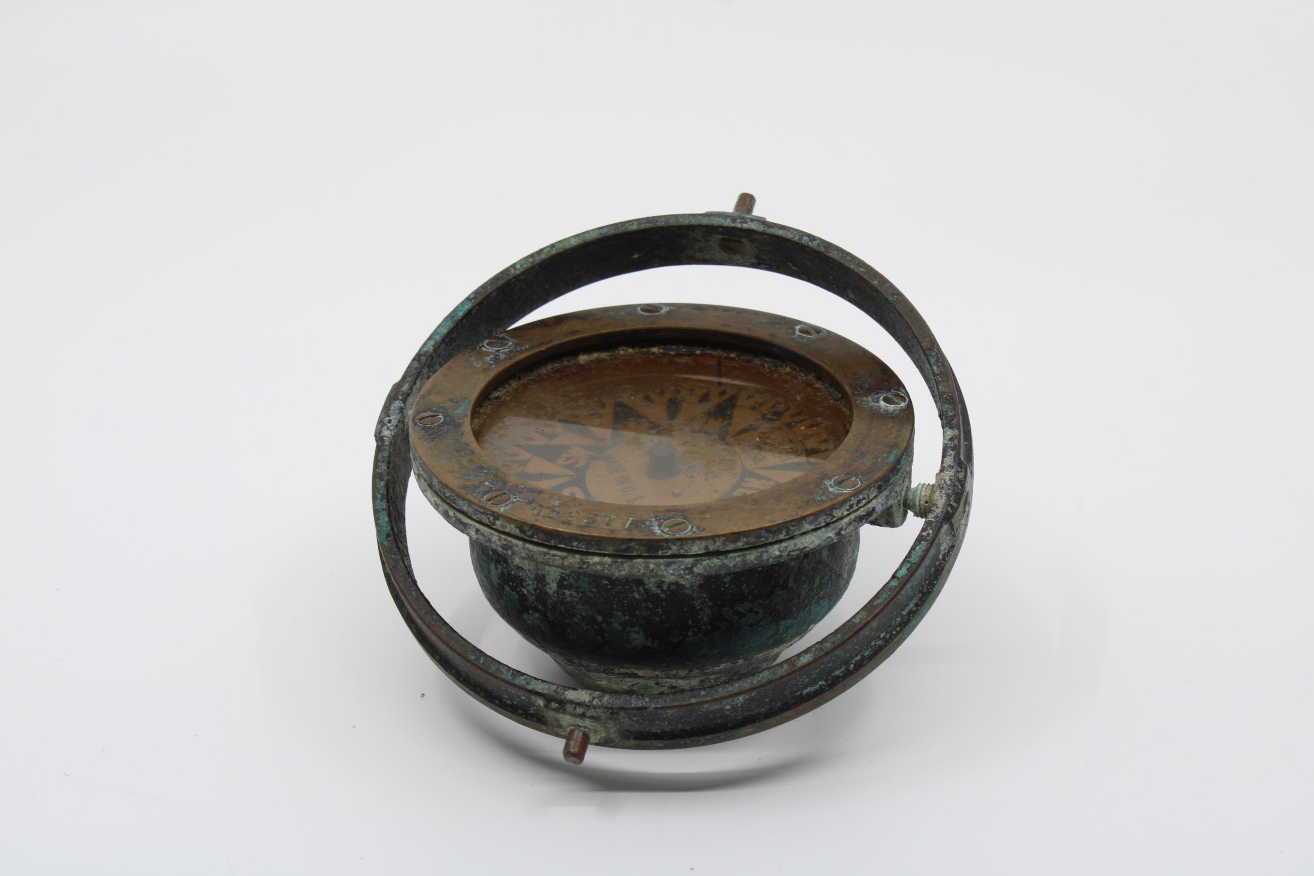 A heavily tarnished brass compass lacking its outer wooden or metal casing.