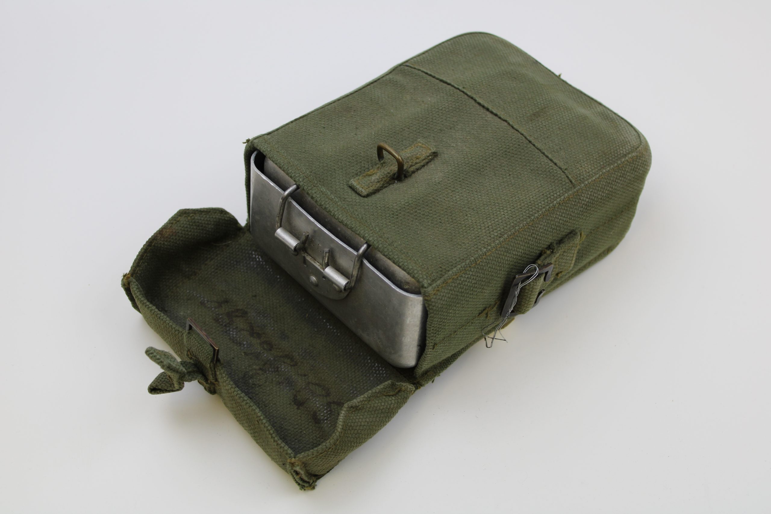 A two-piece aluminum mess tin set with folding wire handles, housed in a green canvas carrying case. The rectangular tins are nested together when sto