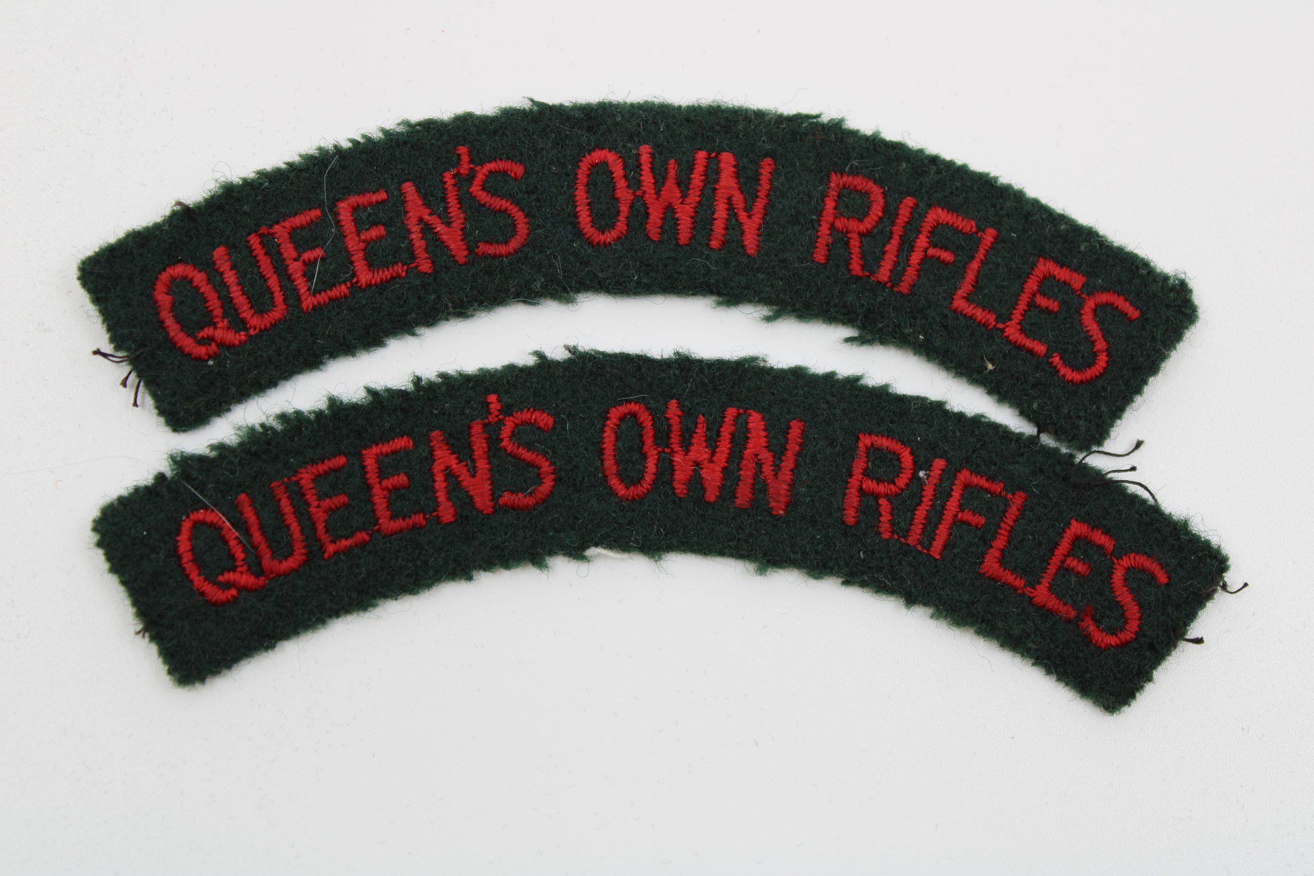 Two curved dark green wool shoulder titles embroidered in bright red thread with the words “QUEEN’S OWN RIFLES.” These insignia were worn on the