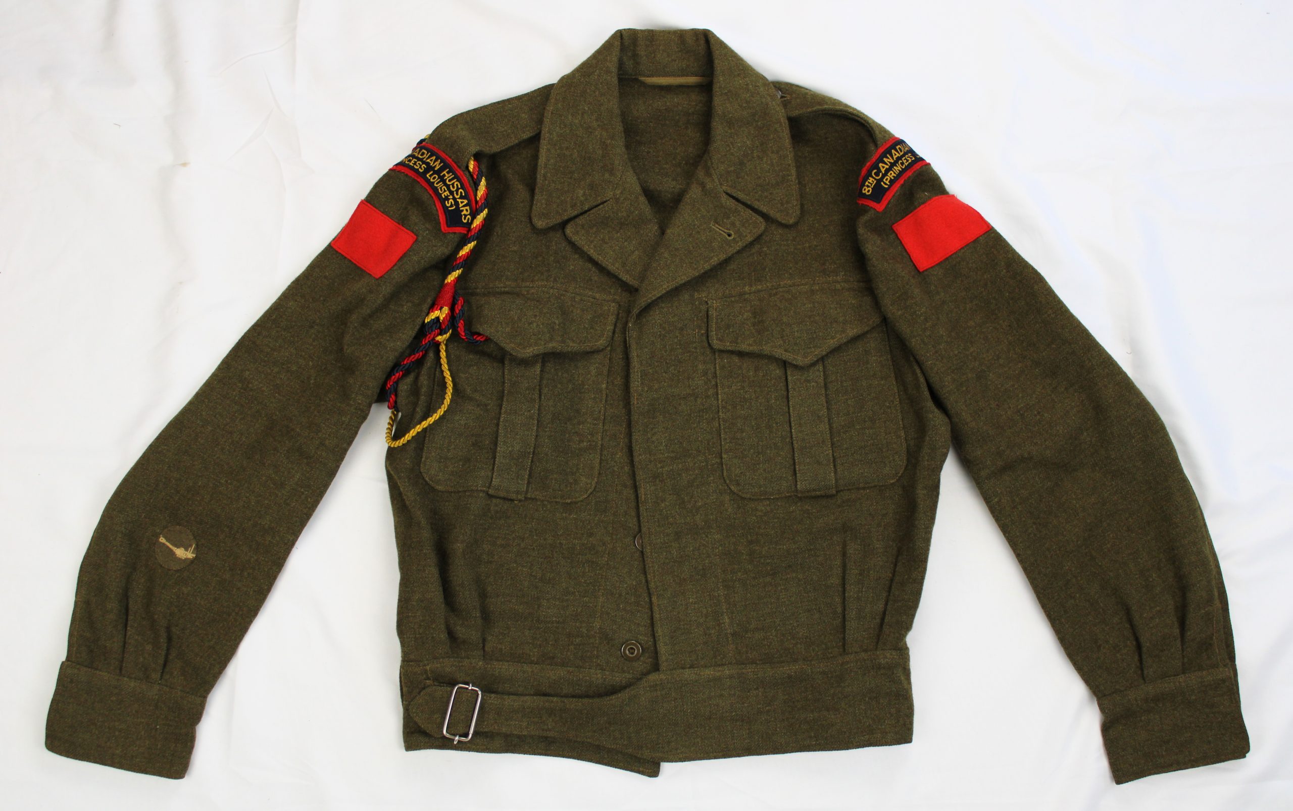Olive green wool battle dress blouse associated with the 8th Canadian Hussars (Princess Louise’s), a Canadian armoured regiment. The waist-length ja