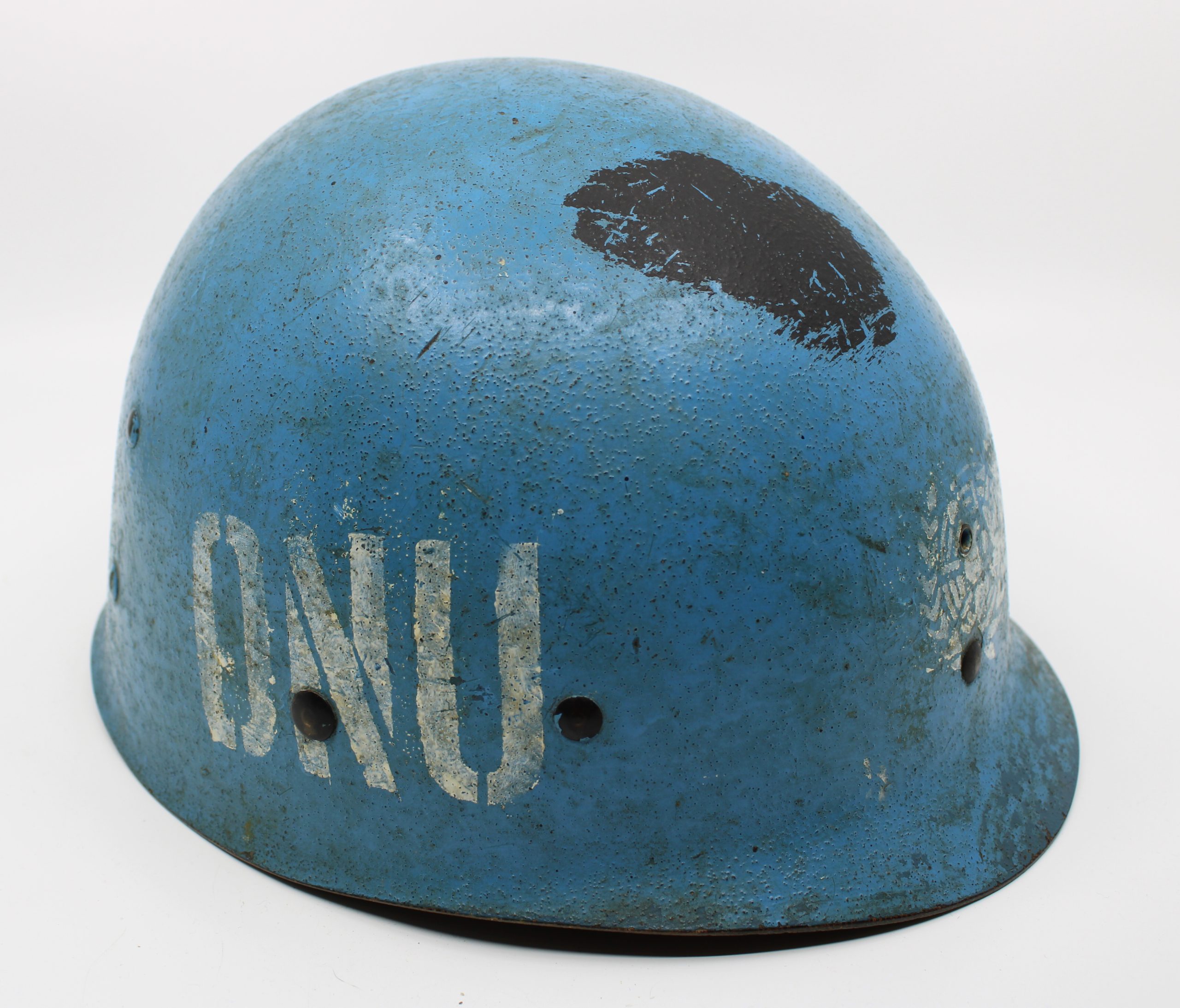 A steel combat helmet painted in United Nations blue with the white letters “ONU” on one side and a faded UN emblem on the other. The surface show