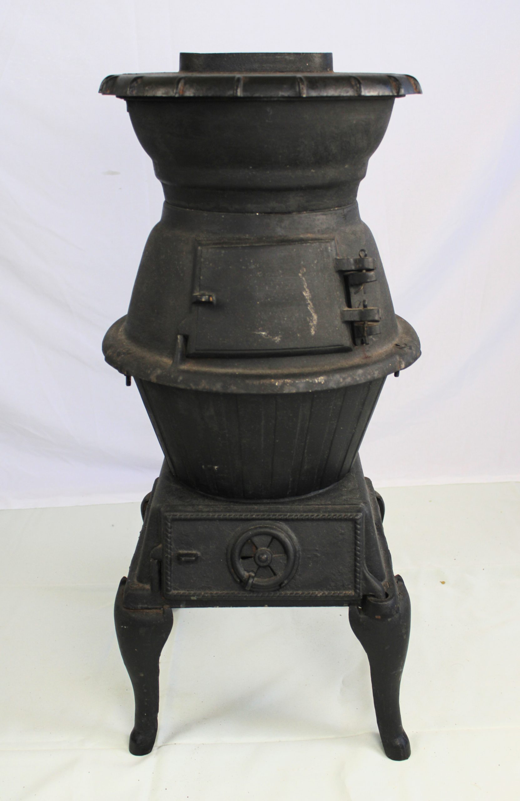 A cast iron coal stove with a bulbous midsection and narrow base, standing on four curved legs. The stove features: