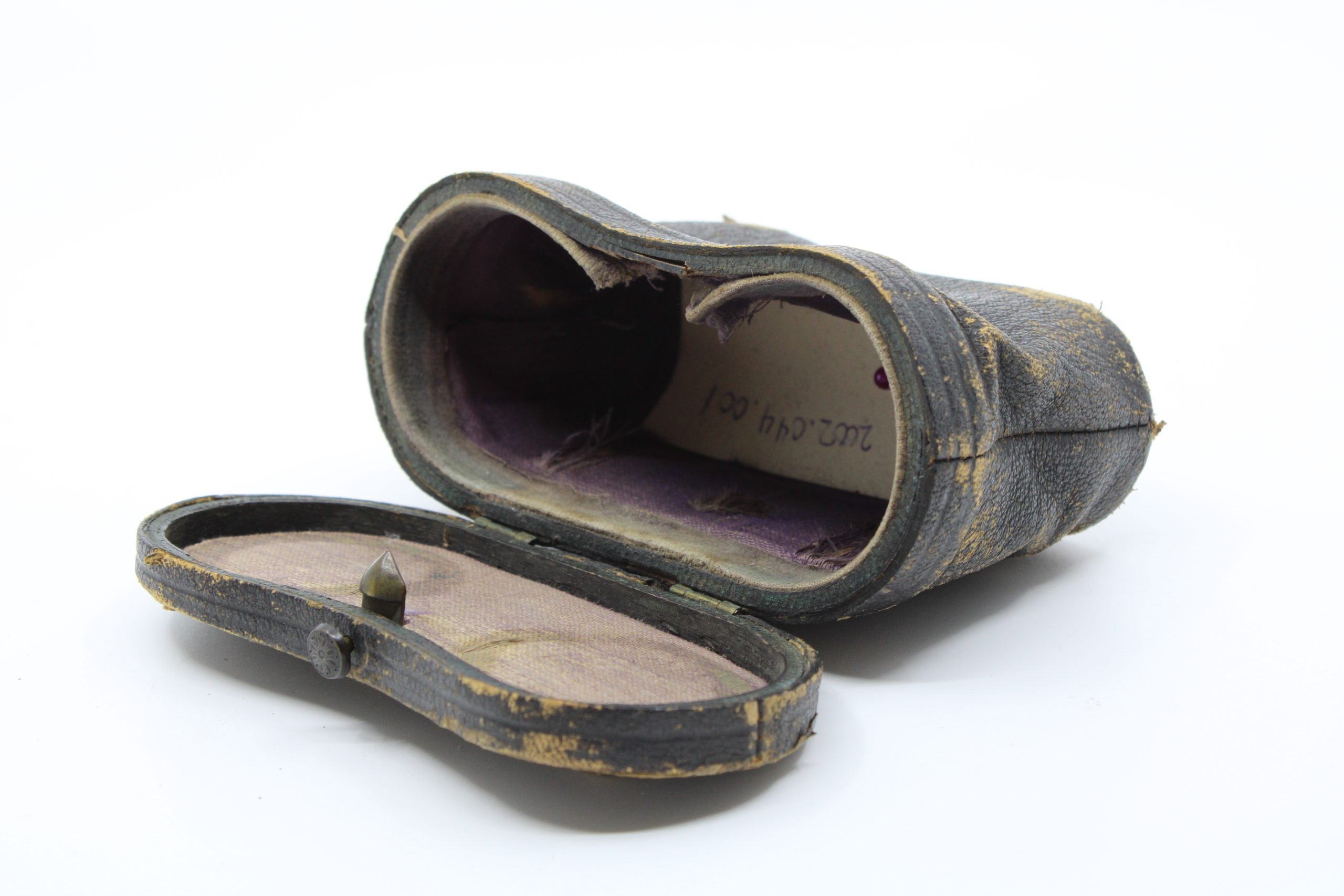 A black leather binocular case with an oval body and fitted lid. The top includes a short leather handle, and a metal button clasp secures the front.