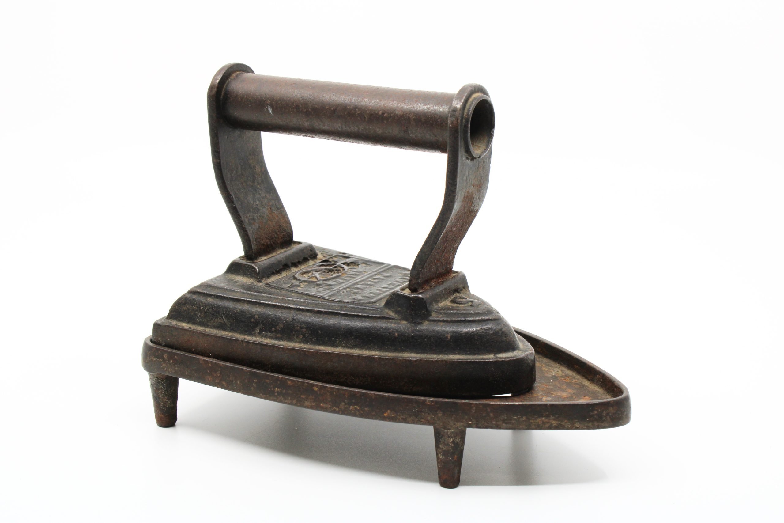 Heavy cast iron clothing iron with a detachable trivet (stand). The iron features a solid metal handle attached to a flat, triangular base with a poin