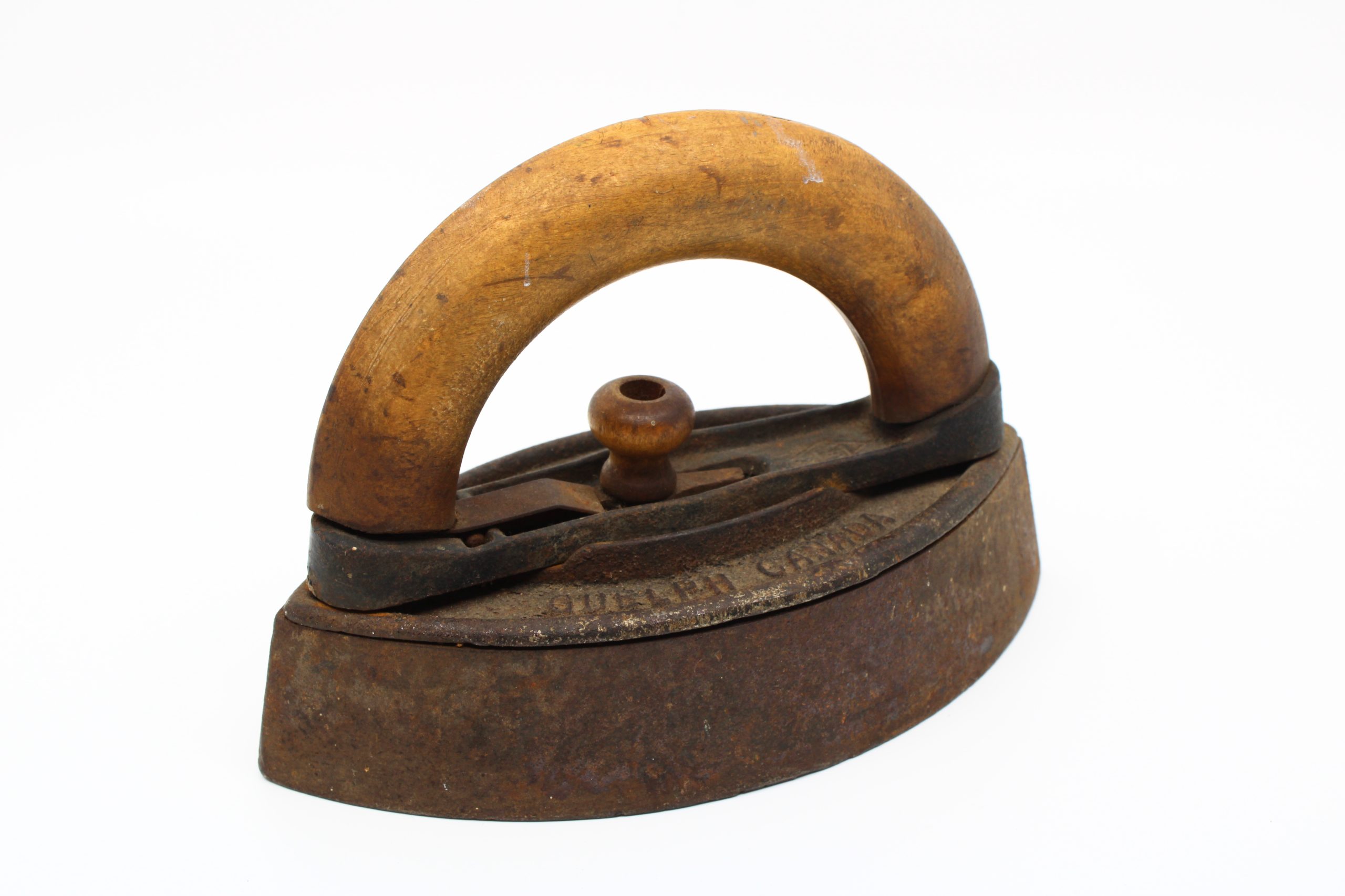 Heavy cast iron clothes iron with a wooden handle and hollow interior compartment designed to hold hot coals or a heated slug. The body is wedge-shape