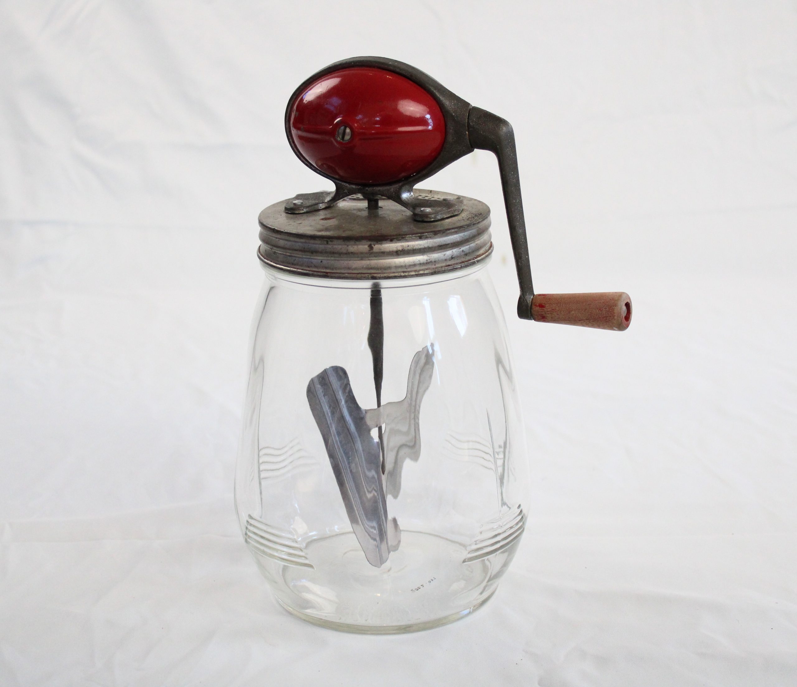 A glass butter churn consisting of a clear glass jar fitted with a metal lid and mechanical hand-crank mechanism. The lid features a red-painted metal