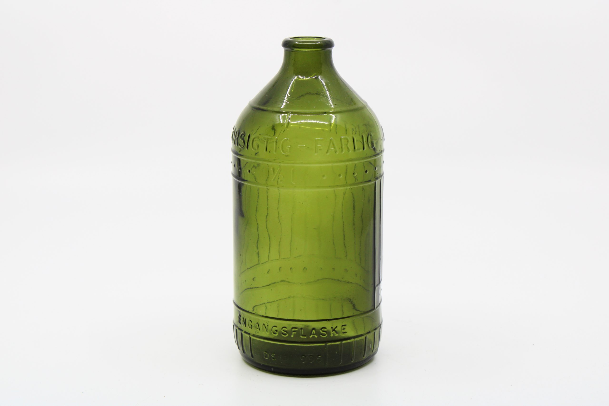 Green colored glass bottle with vertical and horizontal molded lines running along the body.