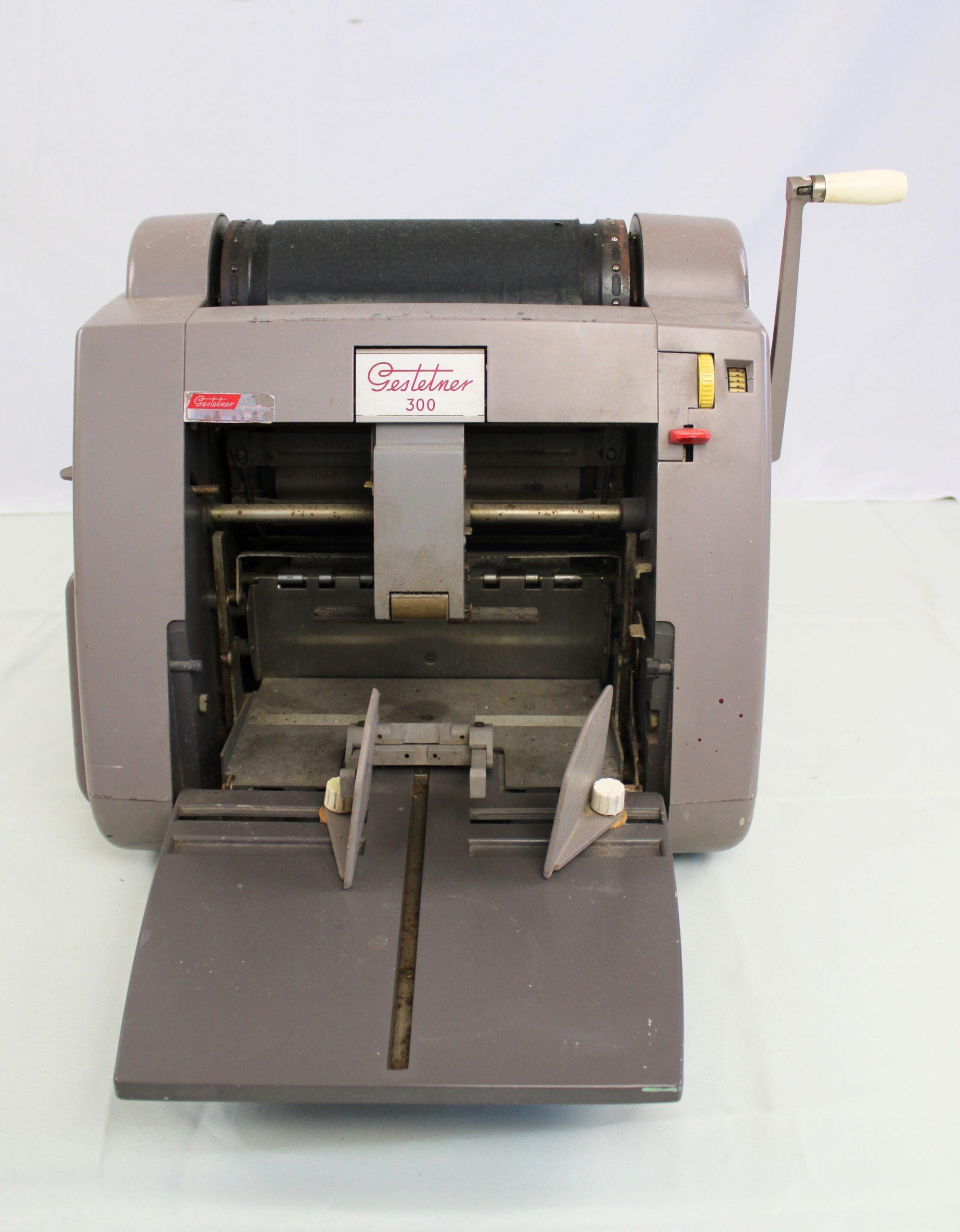 Manual Gestetner 300 duplicator (mimeograph machine) with a grey painted metal casing, featuring: