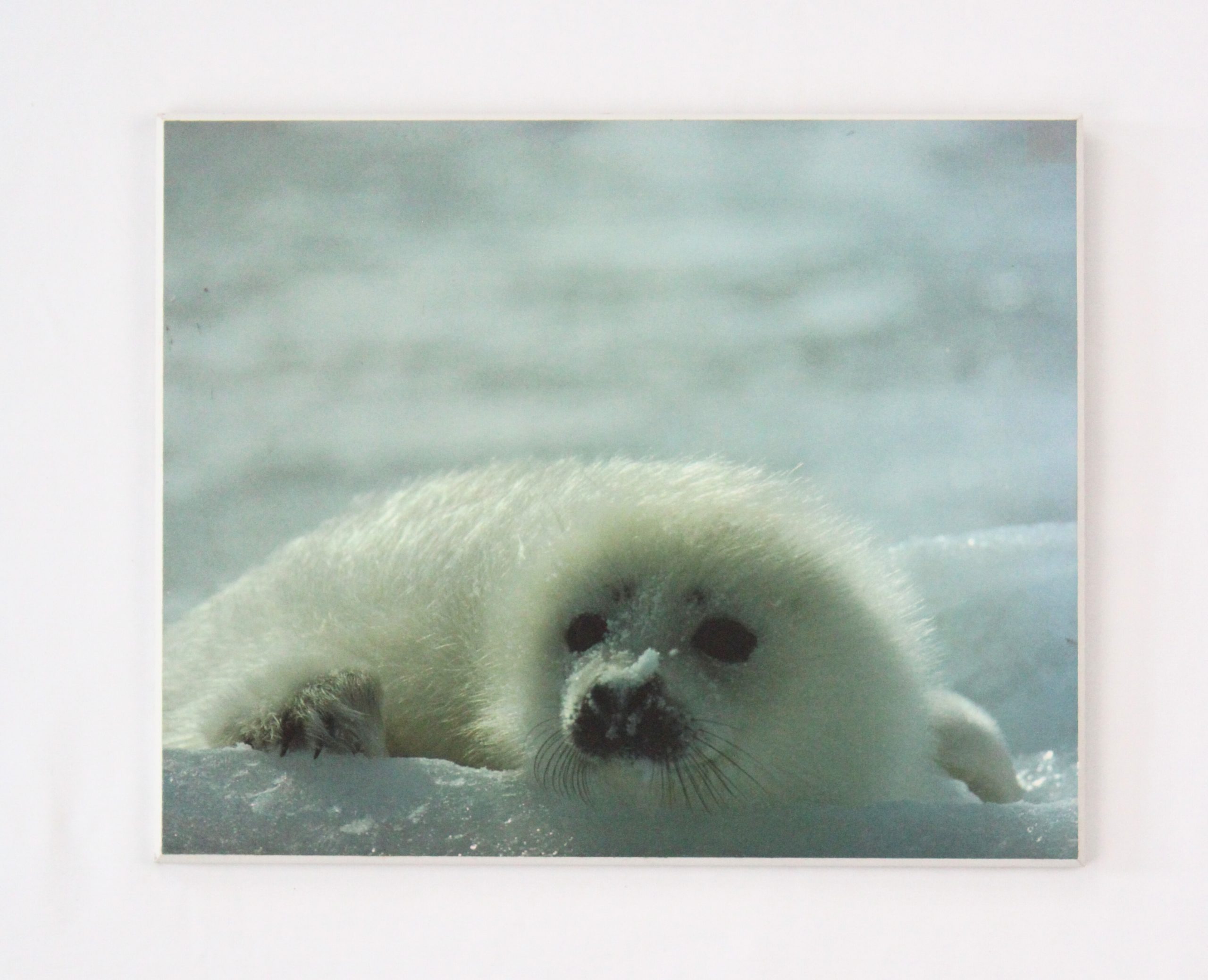 Laminated color photograph depicting a white harp seal pup resting on ice.