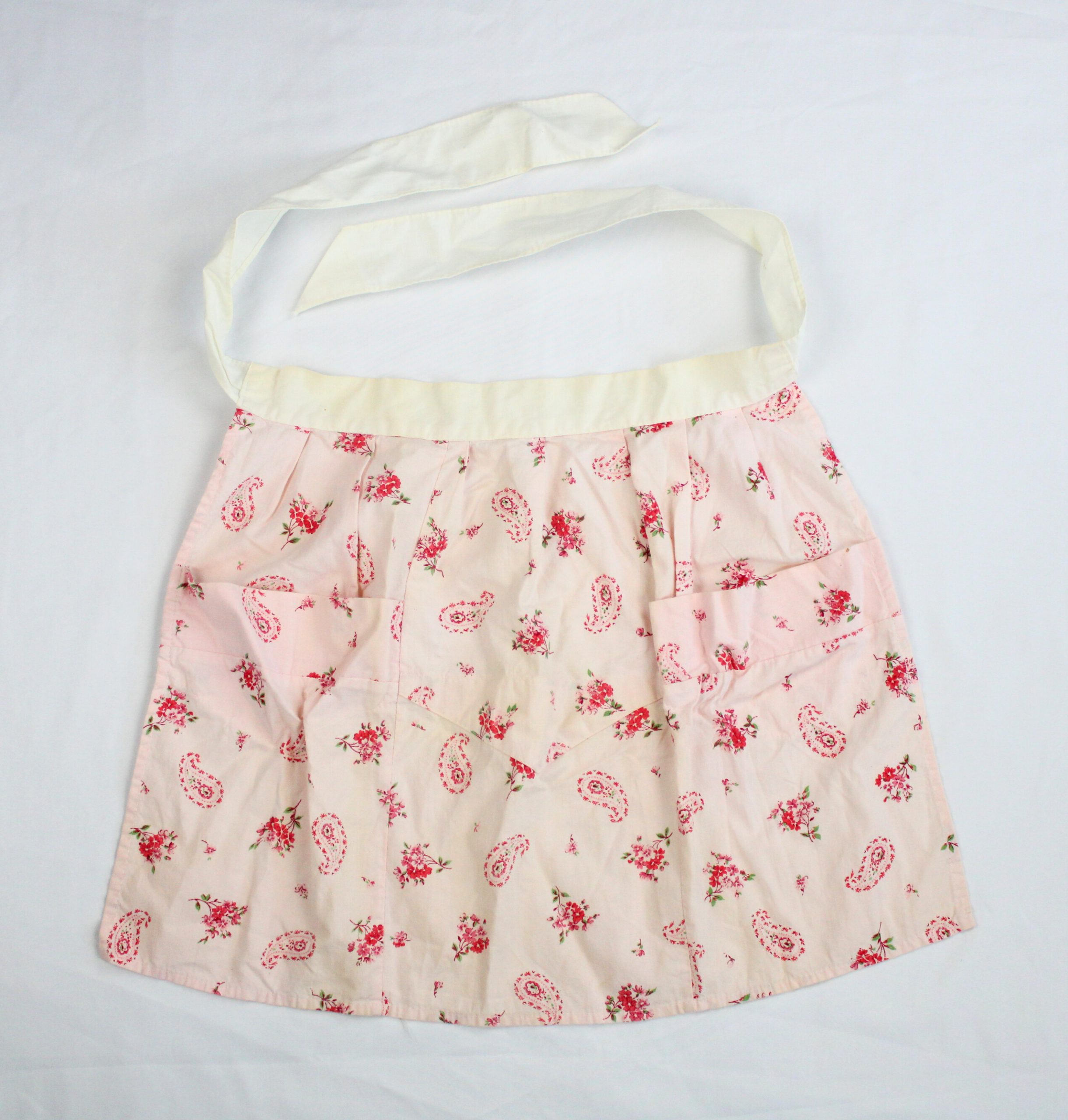 Light pink half apron with a printed floral and paisley pattern in shades of red and white. The apron features a wide, plain white waistband and ties,