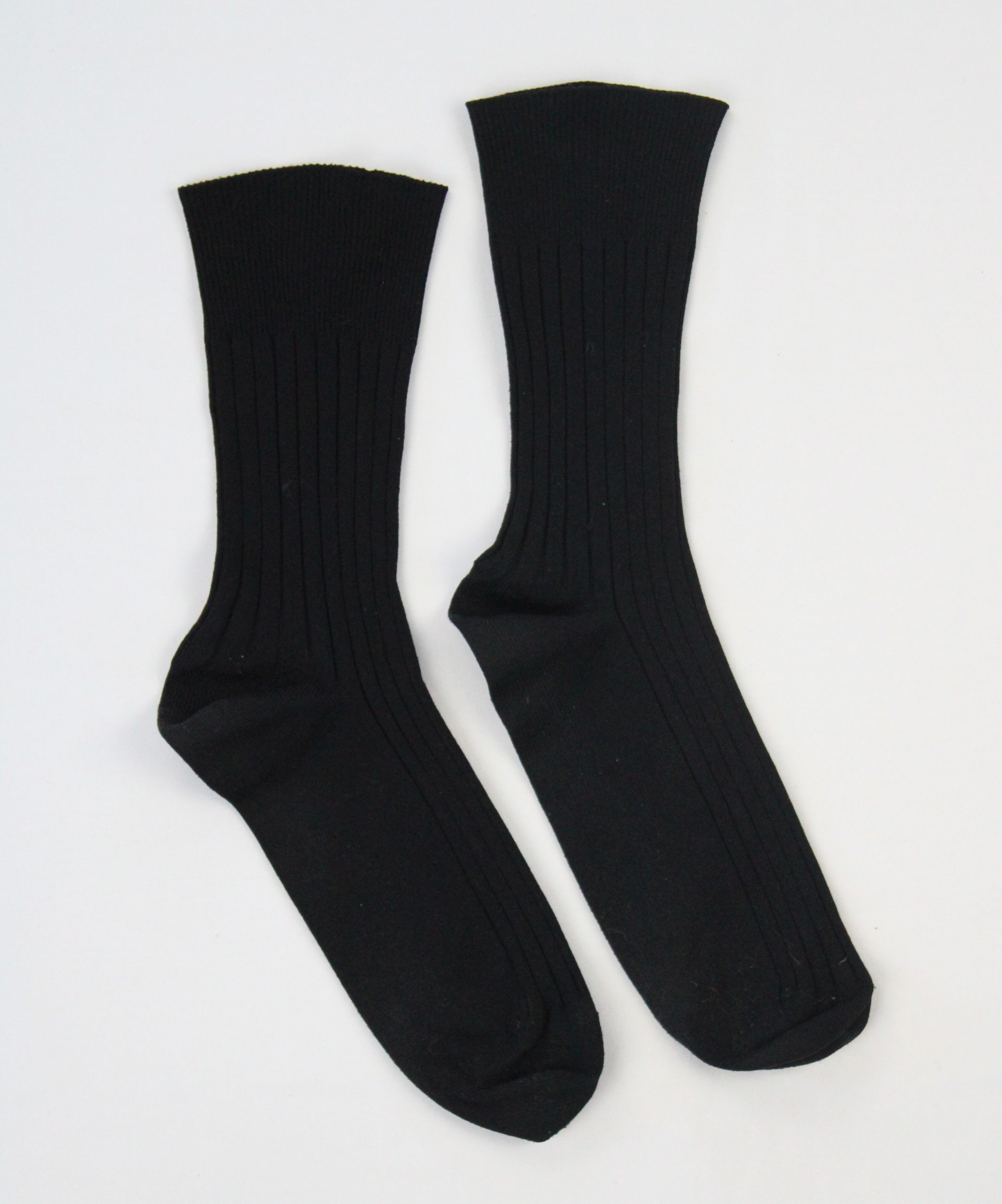 Pair of thin black nylon dress socks with a vertical ribbed pattern running down the leg and across the top of the foot. The socks are lightweight, cl