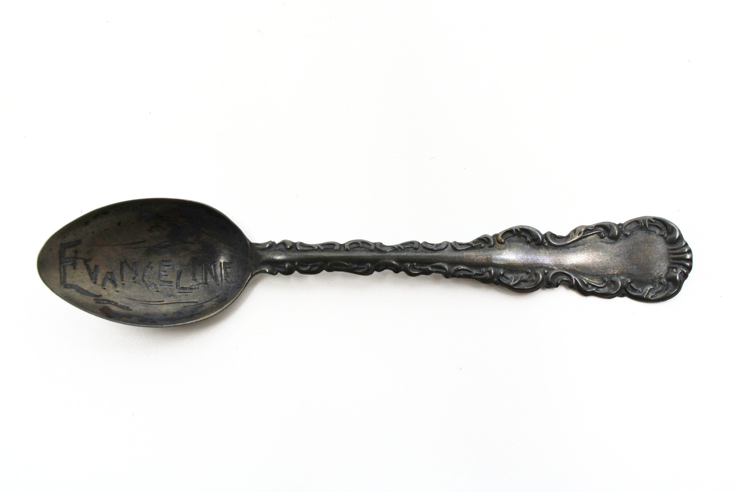 Decorative metal souvenir spoon with the word “Evangeline” engraved in block letters within the bowl. The handle features an ornate scroll and lea