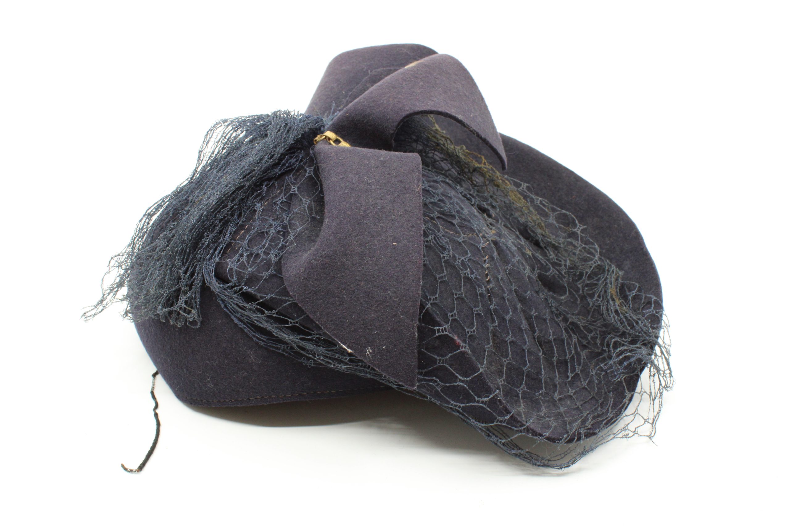 A women’s navy wool hat designed to sit on the crown of the head, with a large front brim. The brim is adorned with navy netting (veil) that extends