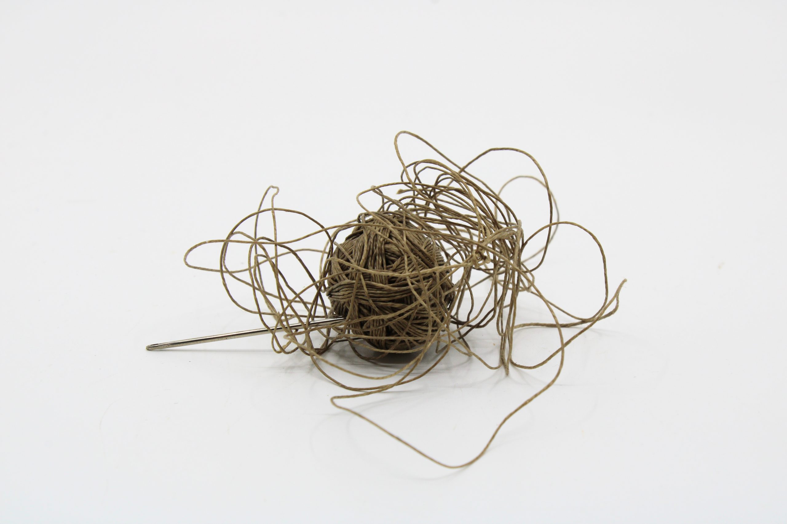 A metal sewing needle (approx. 2 inches long) inserted into a ball of beige thread. The thread is tightly wound at the center but tangled around the e