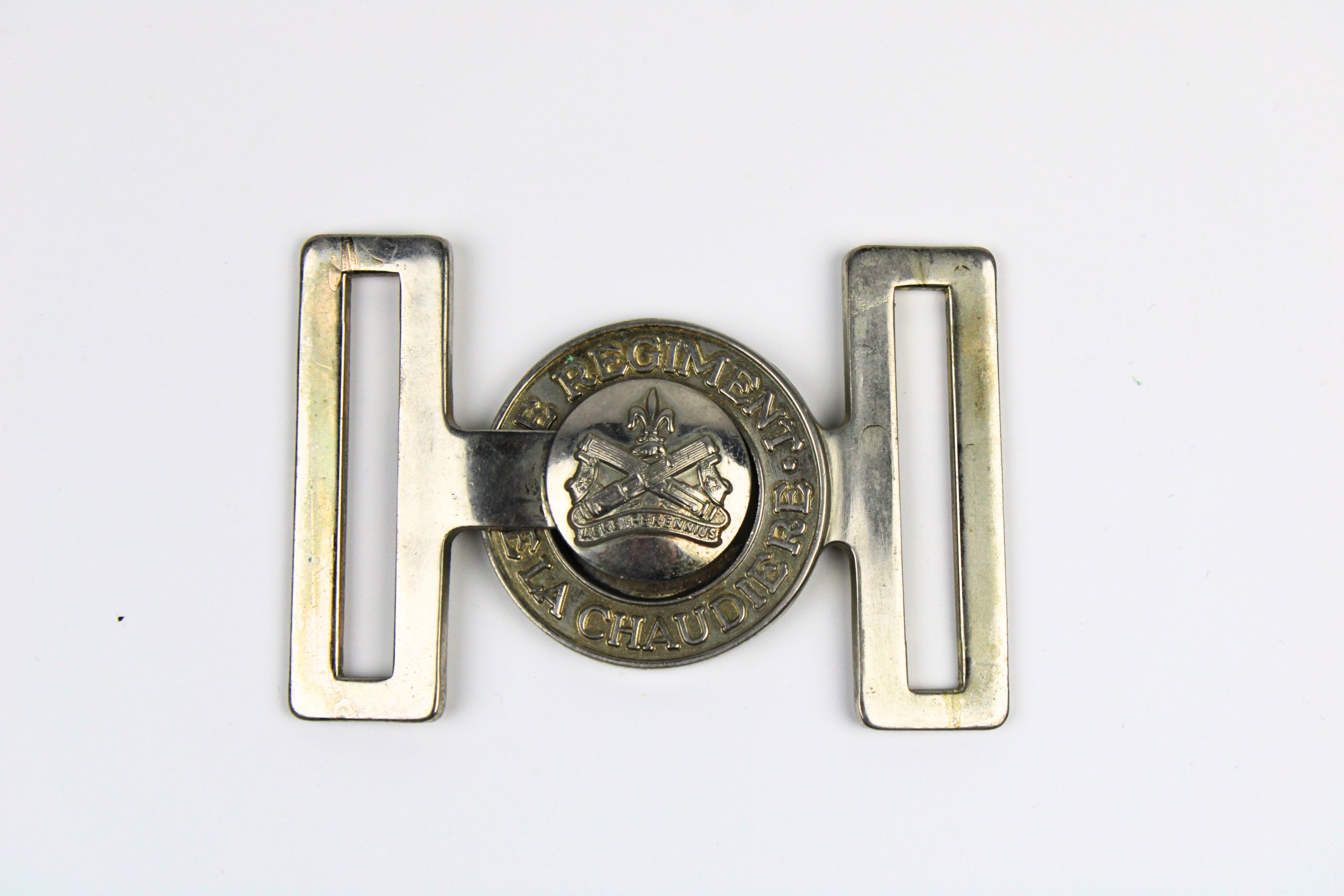 Two-piece metal belt buckle featuring the insignia of Le Régiment de la Chaudière.