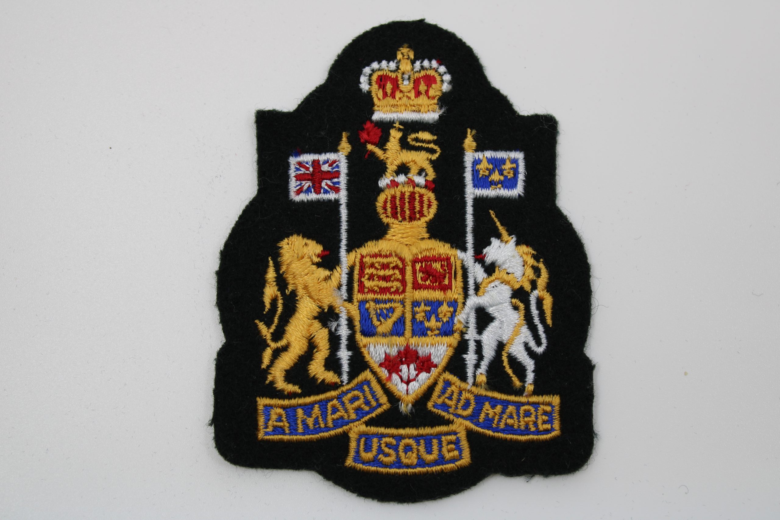 An embroidered Canadian Armed Forces Chief Warrant Officer (CWO) rank badge featuring the Canadian Coat of Arms in full colour on a black felt backgro