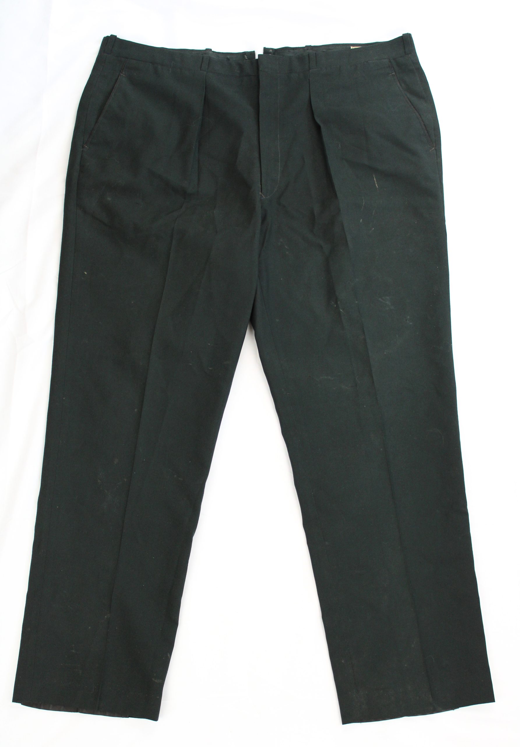 Pair of dark green cotton-blend service dress trousers manufactured for the Canadian Forces (C.F.). The trousers feature front pleats, two side pocket