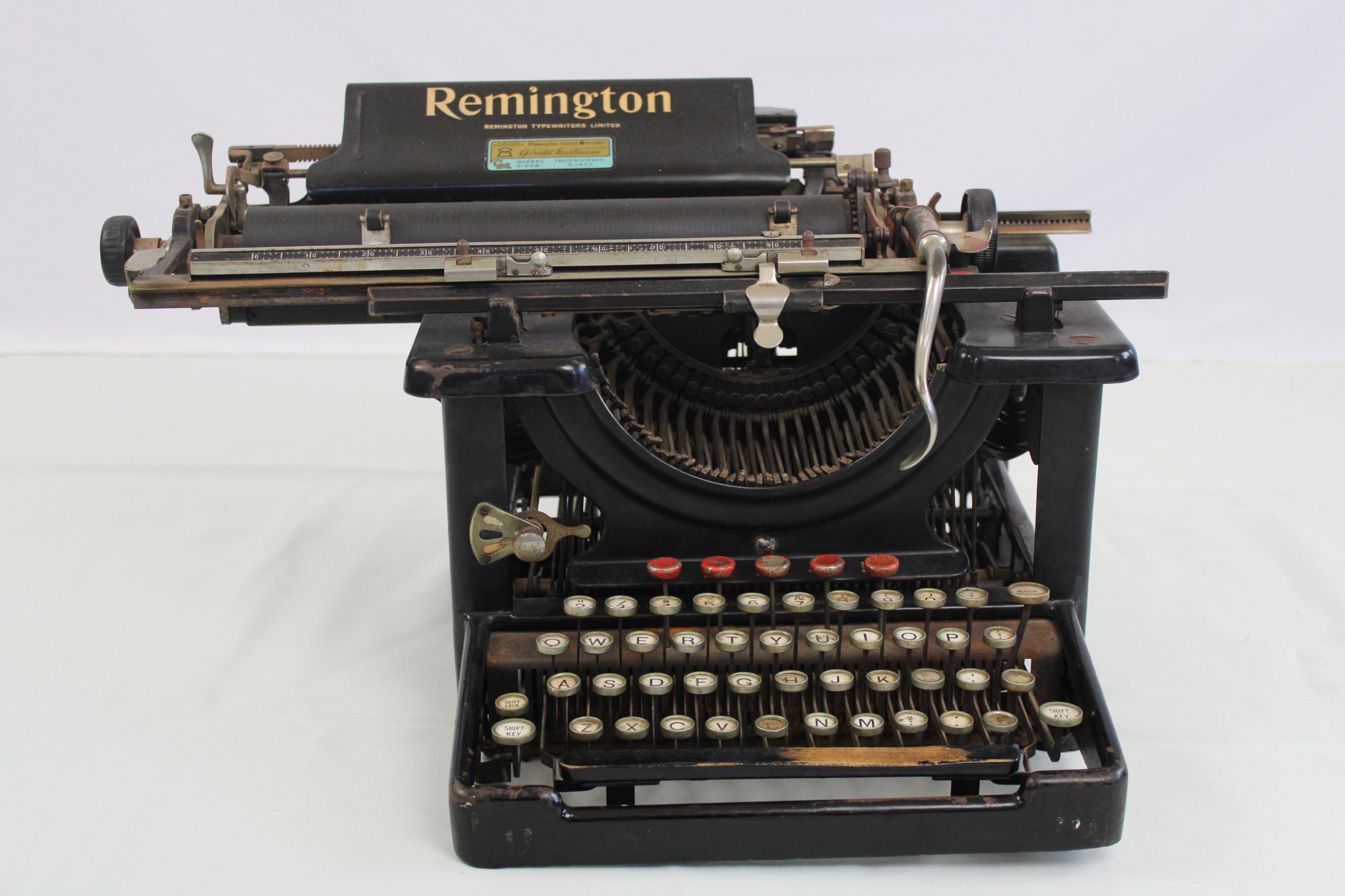 Large, heavy black cast-iron typewriter with visible typebars and open frame.