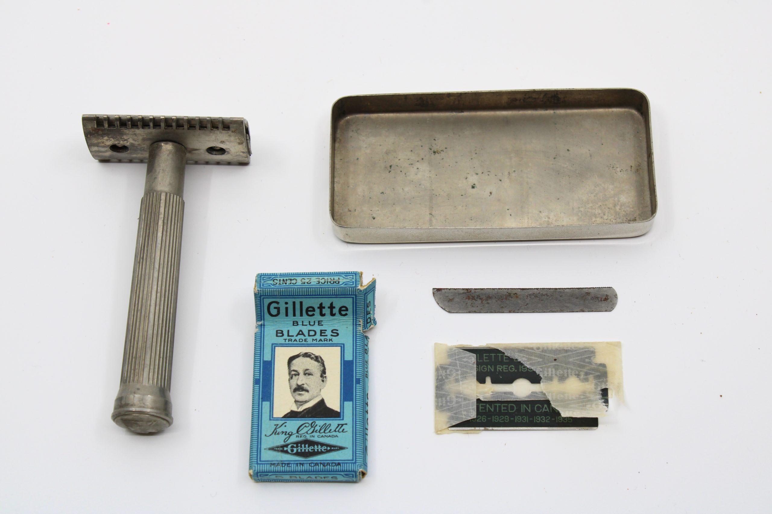 Safety razor set consisting of a metal double-edge razor with textured handle, a rectangular metal case, and a cardboard box of Gillette Blue Blades (
