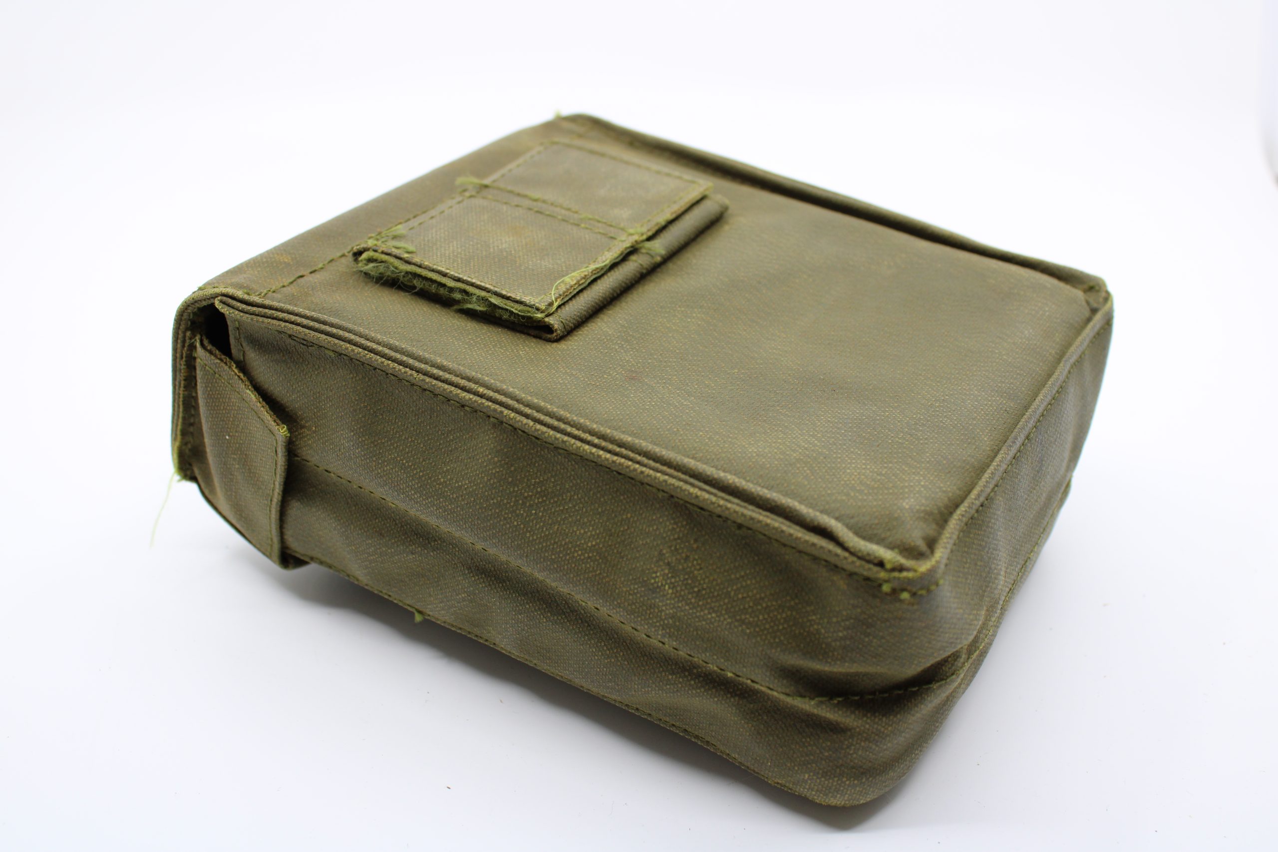 Olive green canvas web harness composed of multiple adjustable straps, 14 plastic buckles, and Velcro closures. The harness is designed for distributi