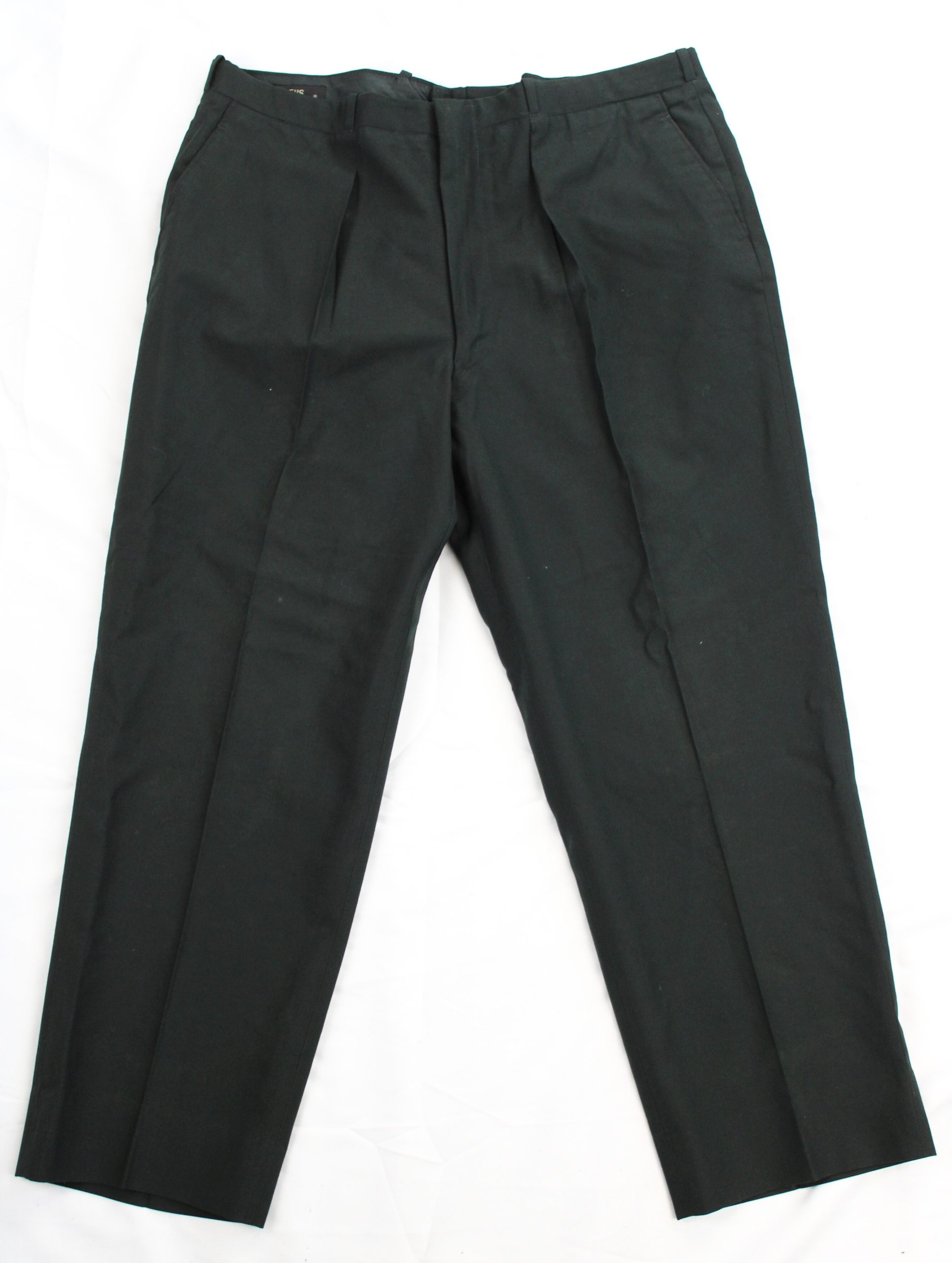 Pair of rifle-green wool-blend military dress trousers with pleated front, two side slit pockets, and two rear welt pockets with button closures. The