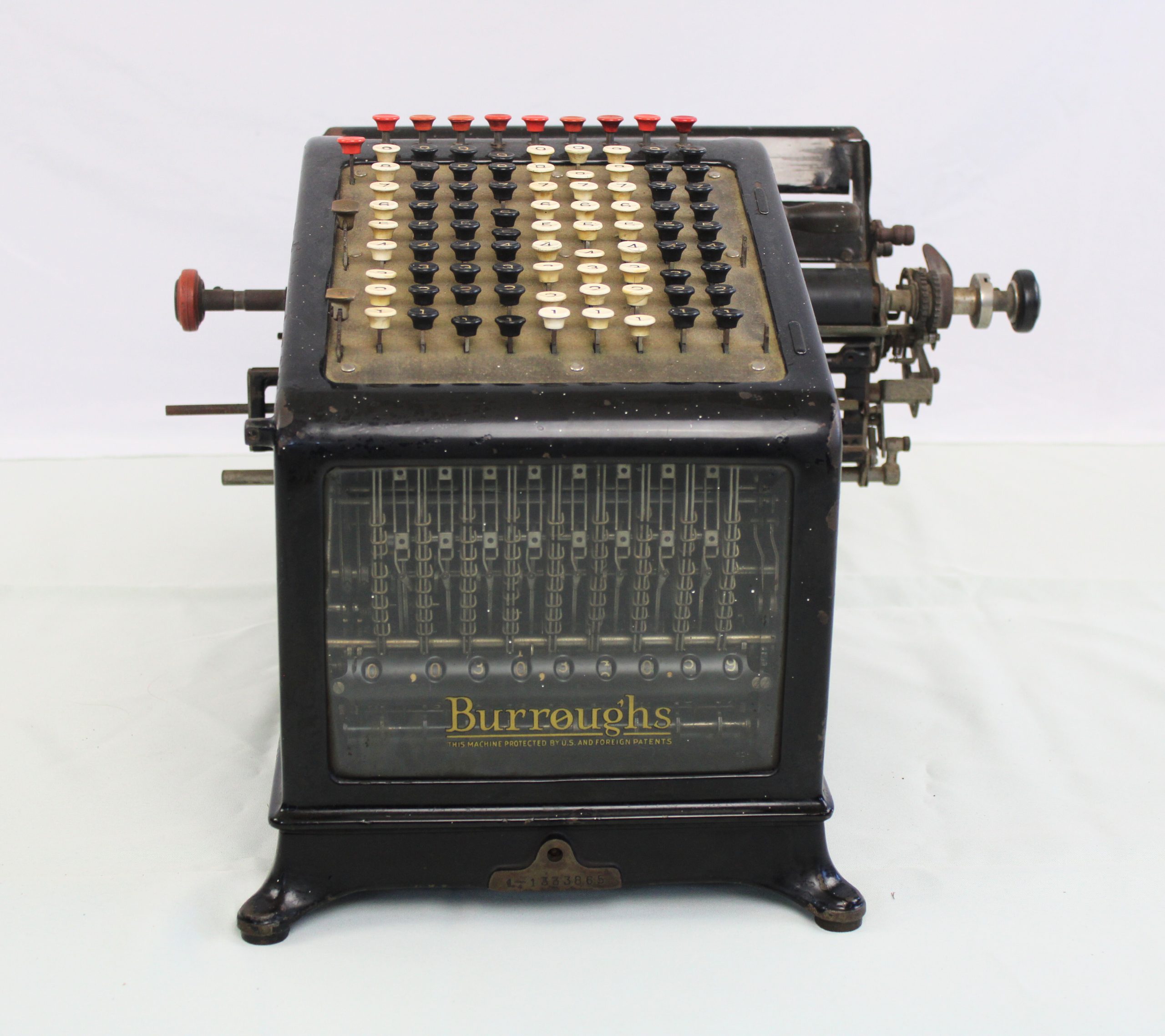 A mechanical adding machine encased in a black metal housing with a glass front window revealing internal number wheels and mechanical registers. The