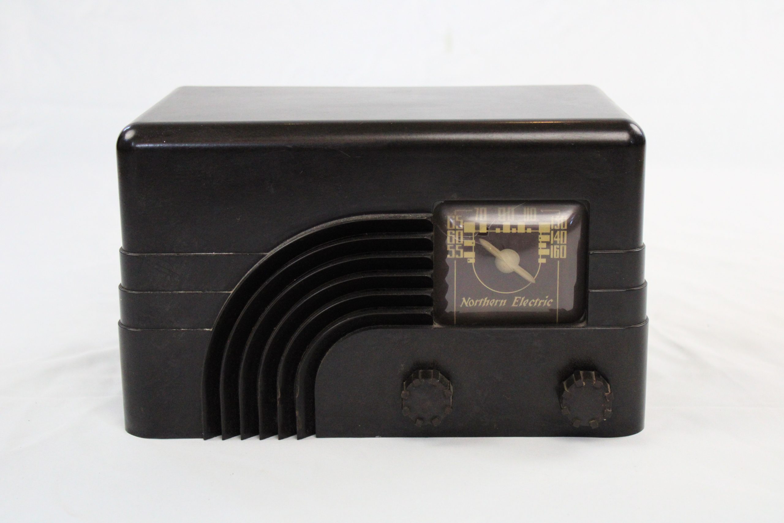 A brown Bakelite tabletop radio featuring a classic Art Deco design with rounded corners and a distinctive curved “rainbow” grill on the front lef