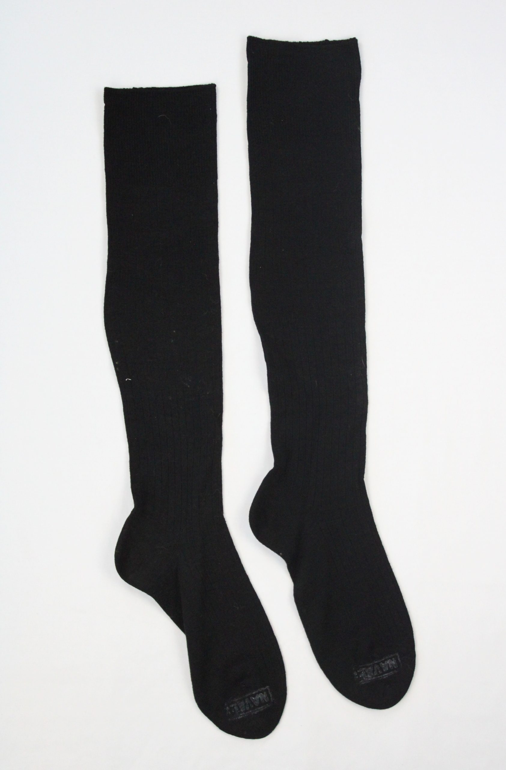 A pair of black knee-high socks, likely part of a Royal Canadian Navy uniform set. The socks are ribbed with vertical knit lines running the full leng