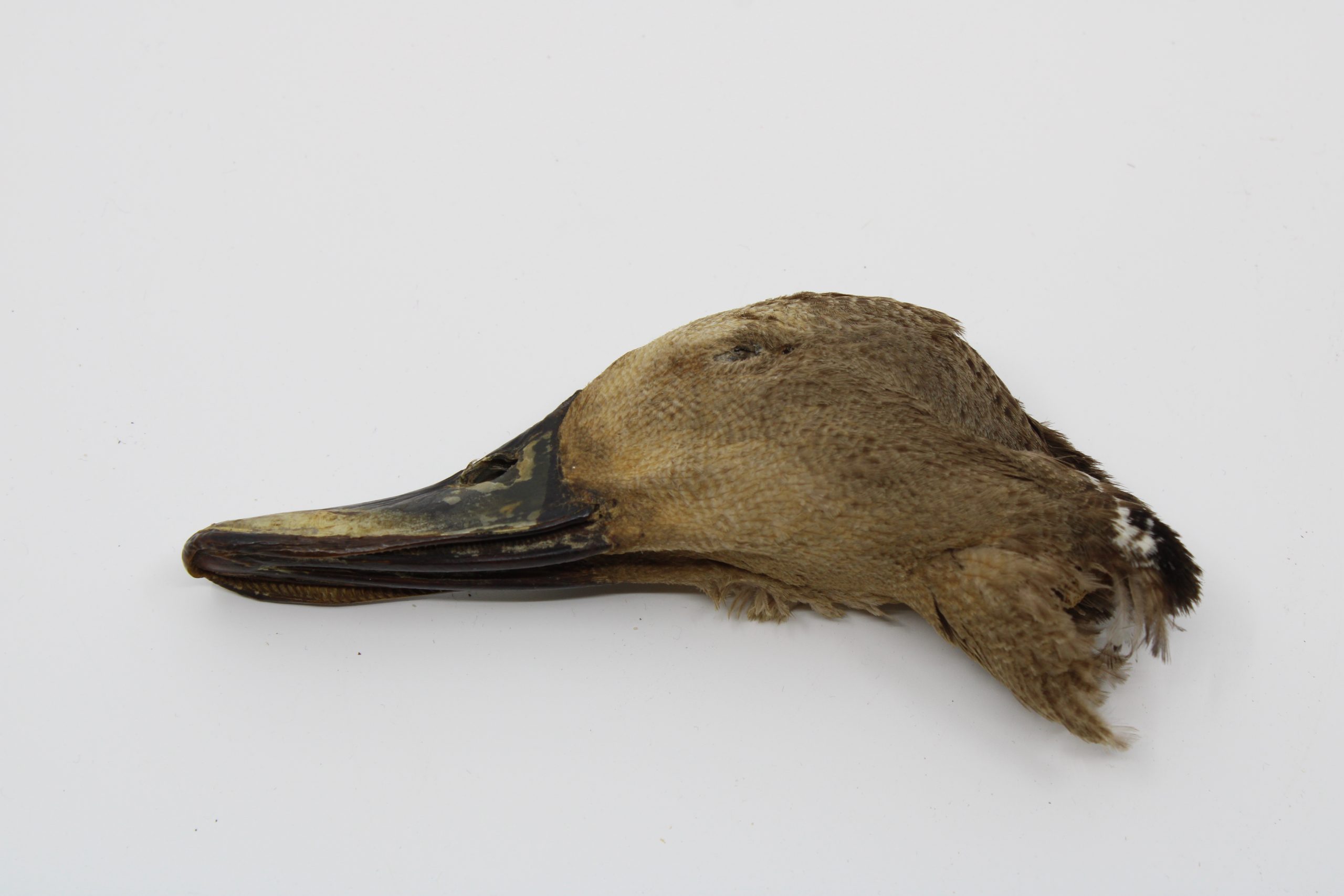 Preserved head of a duck with pale brown plumage and faint white markings on the neck and near the base of the bill. The bill is long, wide, and sligh