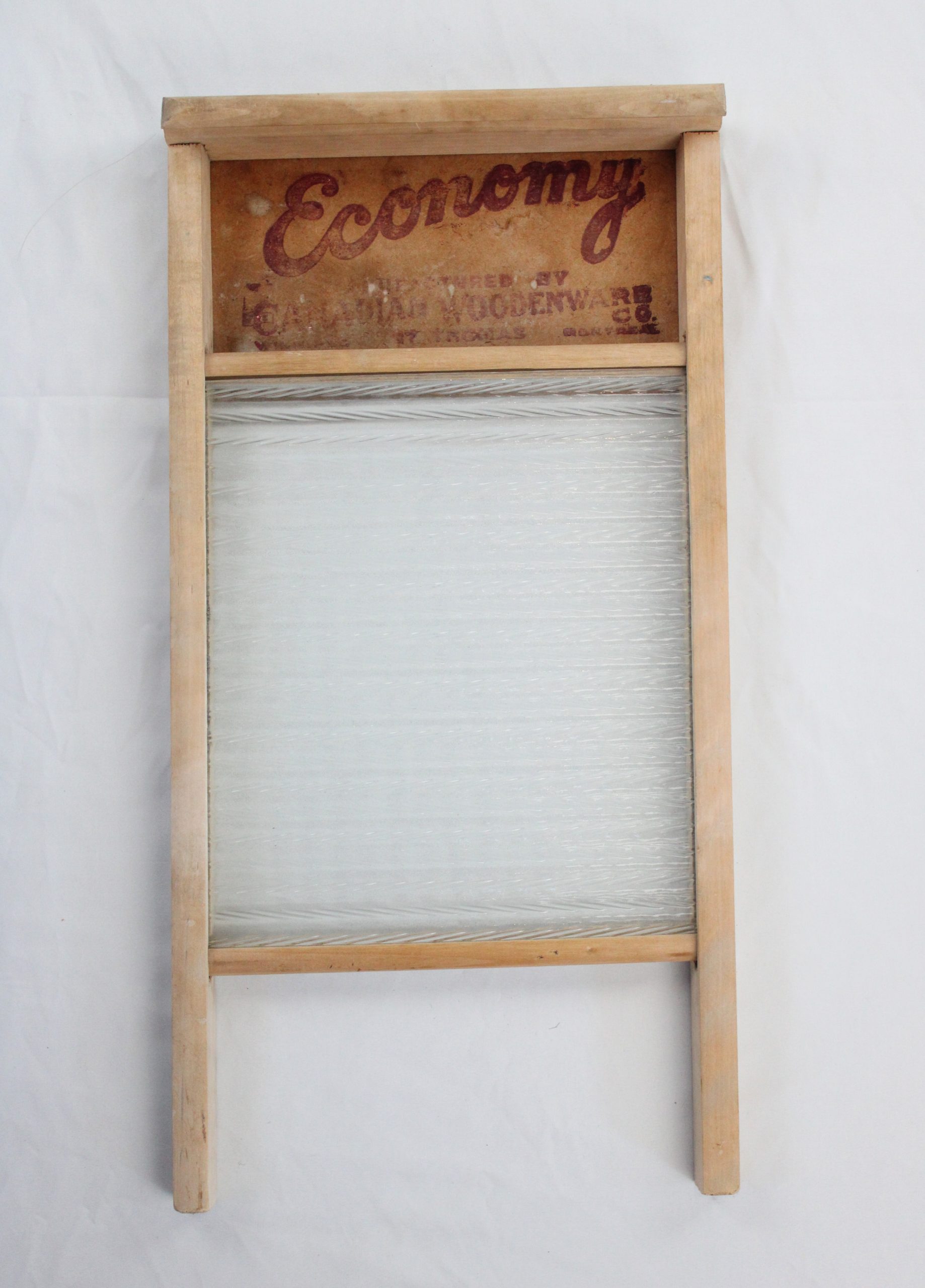 Rectangular wooden-framed washboard with a ribbed glass scrubbing surface. The top wooden panel is printed in red ink with the word “Economy” and