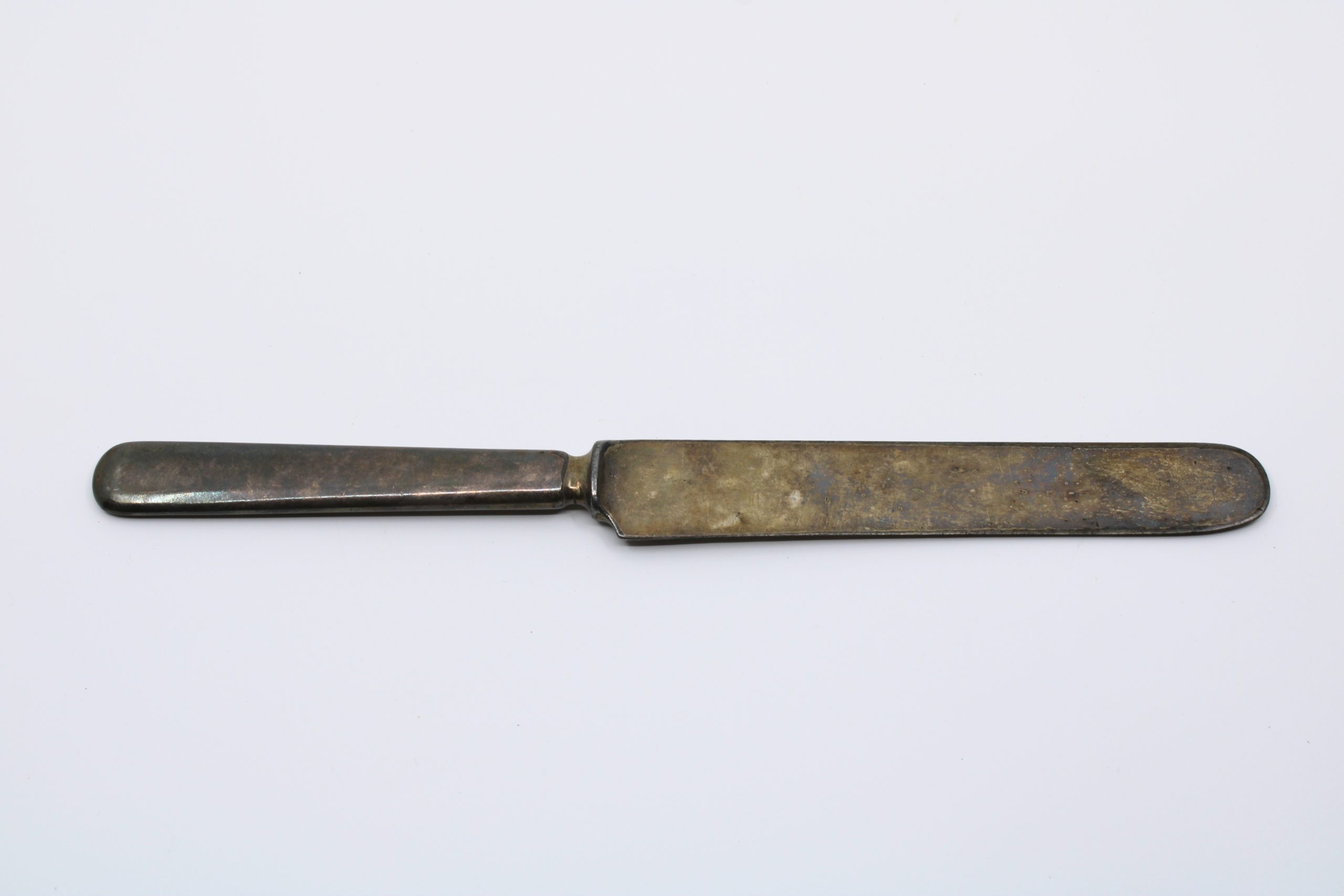 A tarnished silver or silver-plated butter knife with a rounded blade and flat handle.
