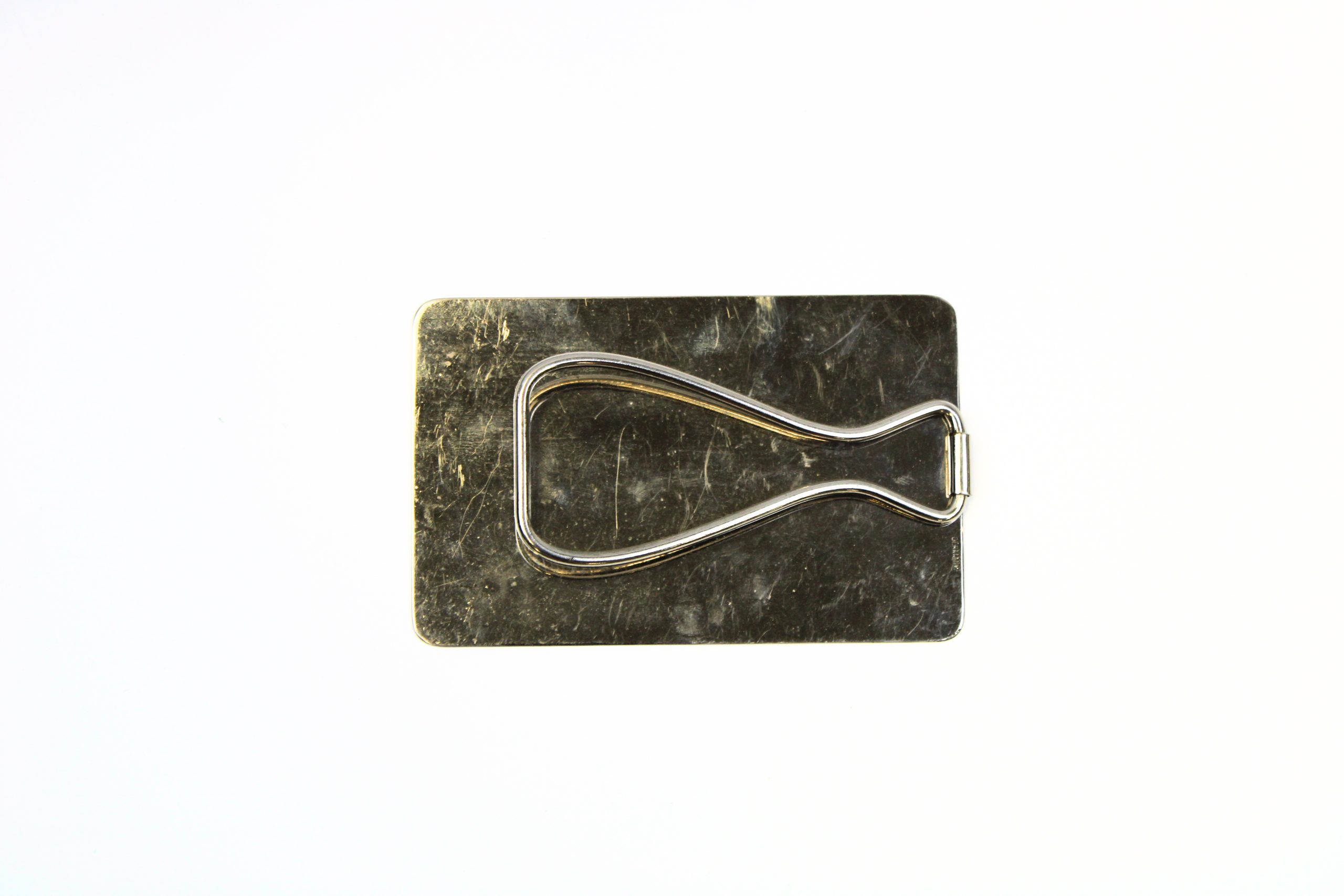 Rectangular polished metal mirror with a folding wire support leg attached to the back, allowing it to stand upright on a flat surface. The reflective