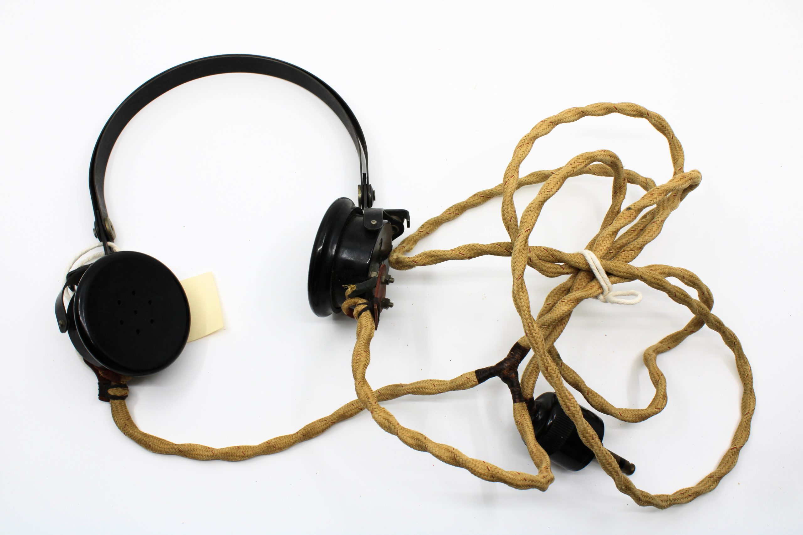 Pair of early black bakelite headphones with wide tan fabric-covered cord and black metal headband. Each earcup is circular, with one side perforated