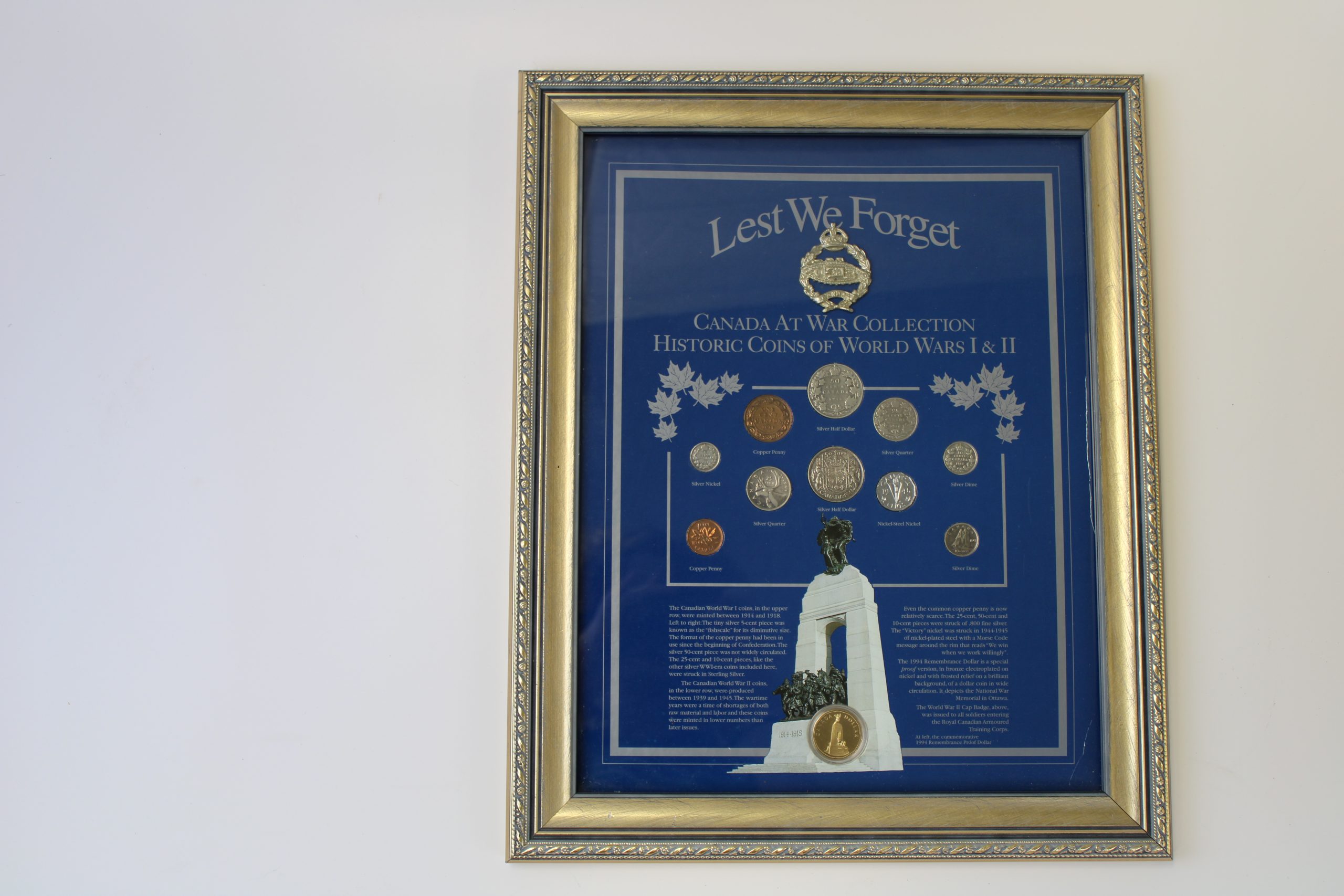 Framed commemorative display titled “Lest We Forget – Canada at War Collection: Historic Coins of World Wars I & II.” The blue background fe